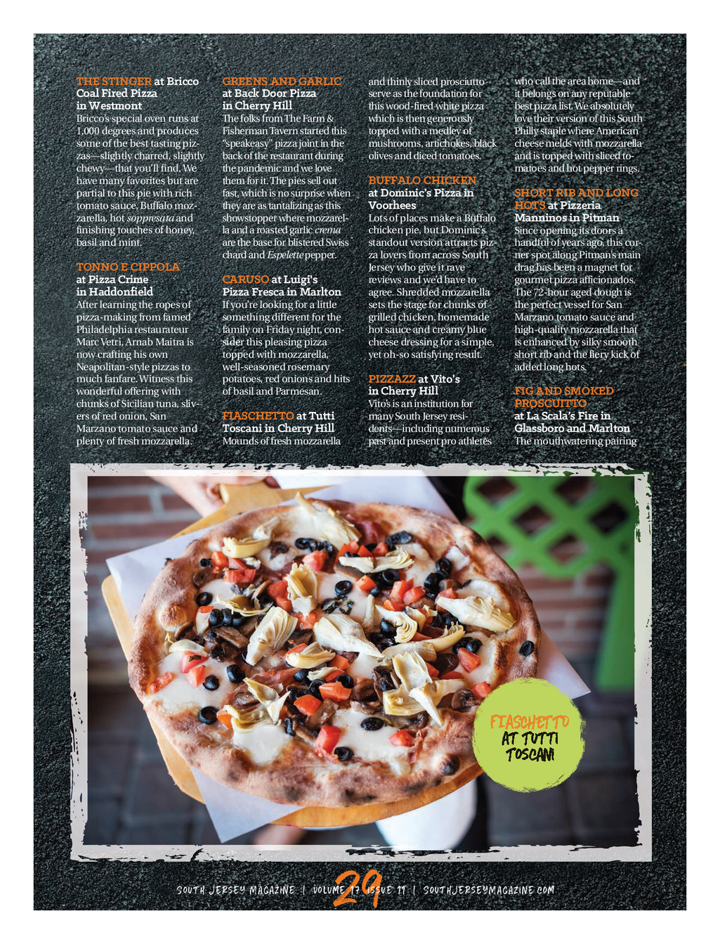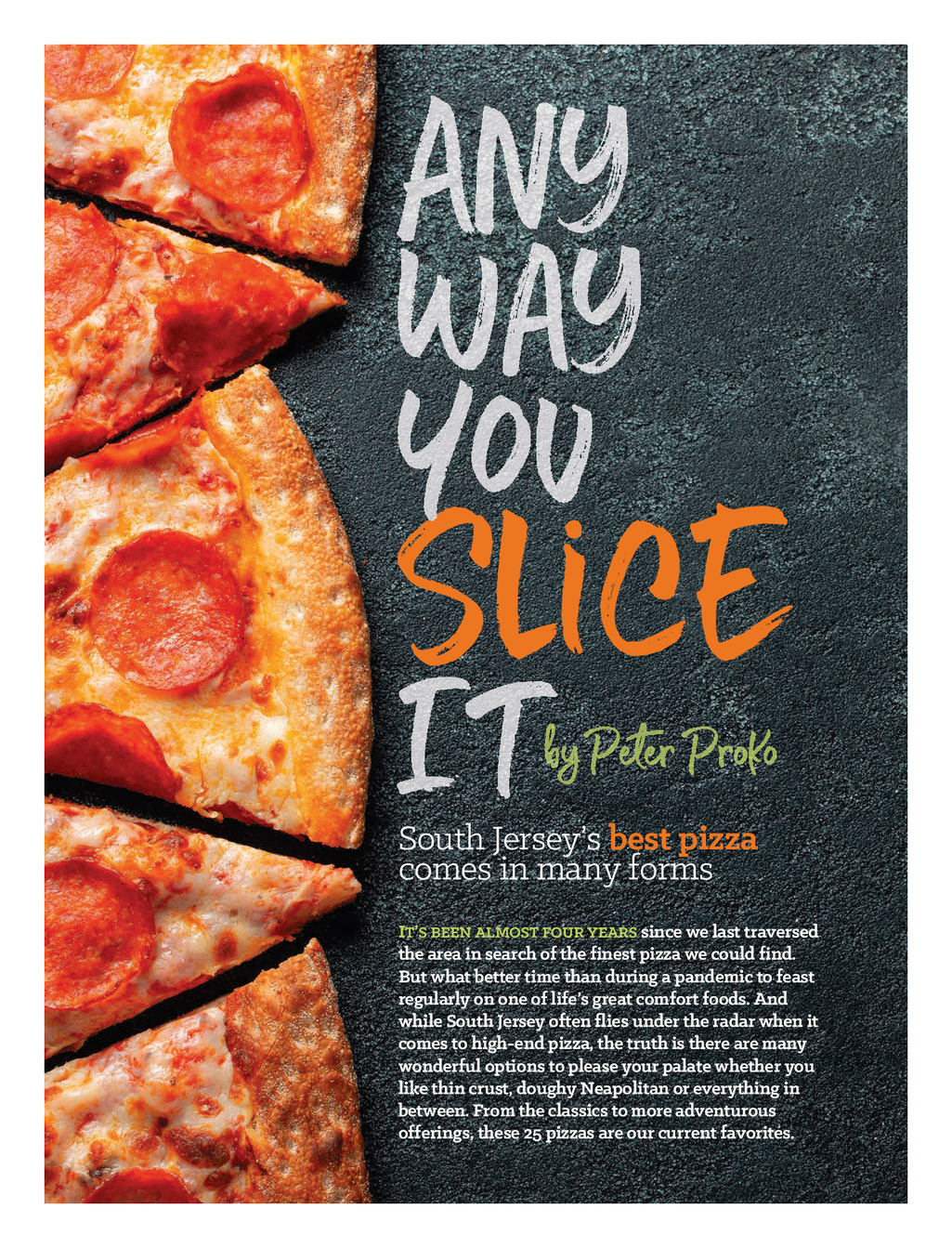 SJM 0221 Best Pizza — FINAL_SJM Feature 2 / 10 / 21 4 : 39 PM Page 1 Slice South Jersey’s best pizza comes in many forms IT’SBEENALMOSTFOURYEARS since we last traversed the area in search of the finest pizza we could find . But what better time than during a pandemic to feast regularly on one of life’s great comfort foods . And while South Jersey often flies under the radar when it comes to high - end pizza , the truth is there are many wonderful options to please your palate whether you like thin crust , doughy Neapolitan or everything in between . From the classics to more adventurous offerings , these 25 pizzas are our current favorites .