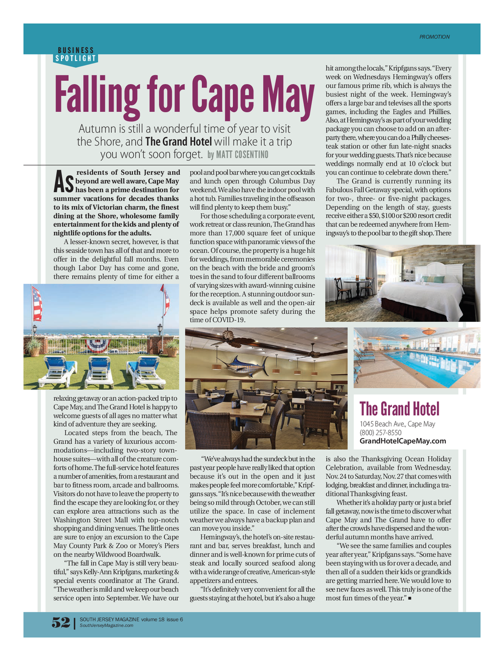 SJM_PROFILE_The_Grand_Hotel_0921_profile 9 / 23 / 21 10 : 20 AM Page 1 PROMOTION B U S I N E S S S P O T L I G H T hit among the locals , ” Kripfgans says . “ Every week on Wednesdays Hemingway’s offers our famous prime rib , which is always the busiest night of the week . Hemingway’s offers a large bar and televises all the sports Falling for Cape May games , including the Eagles and Phillies . Also , at Hemingway’s as part of your wedding package you can choose to add on an after - Autumn is still a wonderful time of year to visit party there , where you can do a Philly cheeses - the Shore , and The Grand Hotel will make it a trip teak station or other fun late - night snacks for your wedding guests . That’s nice because you won’t soon forget . by MATT COSENTINO weddings normally end at 10 o’clock but pool and pool bar where you can get cocktails you can continue to celebrate down there . ” residents of South Jersey and The Grand is currently running its a beyond are well aware , Cape May nd lunch open through Columbus Day Fabulous Fall Getaway special , with options has been a prime destination for weekend . We also have the indoor pool with As for two - , three - or five - night packages . summer vacations for decades thanks a hot tub . Families traveling in the offseason Depending on the length of stay , guests to its mix of Victorian charm , the finest will find plenty to keep them busy . ” receive either a $ 50 , $ 100 or $ 200 resort credit dining at the Shore , wholesome family For those scheduling a corporate event , that can be redeemed anywhere from Hem - entertainment for the kids and plenty of work retreat or class reunion , The Grand has ingway’s to the pool bar to the gift shop . There nightlife options for the adults . more than 17,000 square feet of unique A lesser - known secret , however , is that function space with panoramic views of the this seaside town has all of that and more to ocean . Of course , the property is a huge hit offer in the delightful fall months . Even for weddings , from memorable ceremonies though Labor Day has come and gone , on the beach with the bride and groom’s there remains plenty of time for either a toes in the sand to four different ballrooms of varying sizes with award - winning cuisine for the reception . A stunning outdoor sun - deck is available as well and the open - air space helps promote safety during the time of COVID - 19 . relaxing getaway or an action - packed trip to Cape May , and The Grand Hotel is happy to The Grand Hotel welcome guests of all ages no matter what 1045 Beach Ave . , Cape May kind of adventure they are seeking . ( 800 ) 257 - 8550 Located steps from the beach , The GrandHotelCapeMay.com Grand has a variety of luxurious accom - modations — including two - story town - house is also the Thanksgiving Ocean Holiday “ We’ve always had the sundeck but in the suites — with all of the creature com - Celebration , available from Wednesday . past year people have really liked that option forts of home . The full - service hotel features Nov . 24 because to Saturday , Nov . 27 that comes with a number of amenities , from a restaurant and it’s out in the open and it just lodging , breakfast and dinner , including a tra - bar to fitness room , arcade and ballrooms . makes people feel more comfortable , ” Kripf - ditional Thanksgiving feast . Visitors do not have to leave the property to gans says . “ It’s nice because with the weather Whether it’s a holiday party or just a brief find the escape they are looking for , or they being so mild through October , we can still fall getaway , now is the time to discover what can explore area attractions such as the utilize the space . In case of inclement Cape May and The Grand have to offer Washington Street Mall with top - notch weather we always have a backup plan and after the crowds have dispersed and the won - shopping and dining venues . The little ones can move you inside . ” derful autumn months have arrived . are sure to enjoy an excursion to the Cape Hemingway’s , the hotel’s on - site restau - “ We see the same families and couples May County Park & Zoo or Morey’s Piers rant and bar , serves breakfast , lunch and year after year , ” Kripfgans says . “ Some have on the nearby Wildwood Boardwalk . dinner and is well - known for prime cuts of been staying with us for over a decade , and “ The fall in Cape May is still very beau - steak and locally sourced seafood along then all of a sudden their kids or grandkids tiful , ” says Kelly - Ann Kripfgans , marketing & with a wide range of creative , American - style are getting married here . We would love to special events coordinator at The Grand . appetizers and entrees . see new faces as well . This truly is one of the “ The weather is mild and we keep our beach “ It’s definitely very convenient for all the n most fun times of the year . ” service open into September . We have our guests staying at the hotel , but it’s also a huge SOUTH JERSEY MAGAZINE volume 18 issue 6 SouthJerseyMagazine.com 52 |