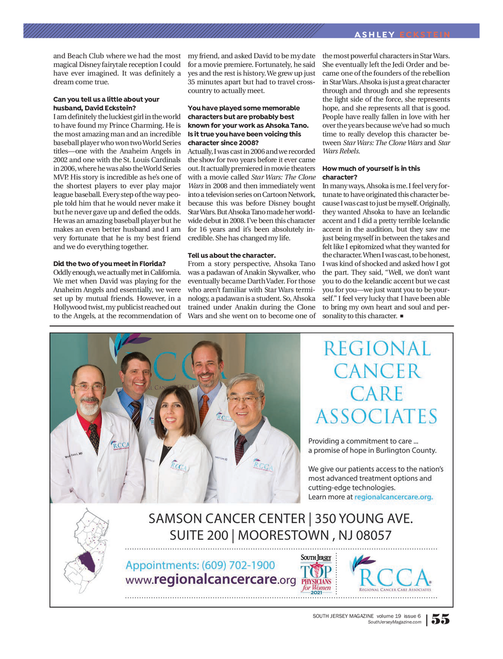 SJM_PEOPLE_Dept_Ashley Eckstein_0922Reg1 . qxp_layout 9 / 26 / 22 11 : 35 AM Page 2 ASHLEY ECKSTEIN and Beach Club where we had the most my friend , and asked David to be my date the most powerful characters in Star Wars . magical Disney fairytale reception I could for a movie premiere . Fortunately , he said She eventually left the Jedi Order and be - have ever imagined . It was definitely a yes and the rest is history . We grew up just came one of the founders of the rebellion dream come true . 35 minutes apart but had to travel cross - in Star Wars . Ahsoka is just a great character country to actually meet . through and through and she represents Can you tell us a little about your the light side of the force , she represents husband , David Eckstein ? Youhave played some memorable hope , and she represents all that is good . I am definitely the luckiest girl in the world charactersbut are probably best People have really fallen in love with her to have found my Prince Charming . He is knownfor your work as Ahsoka Tano . over the years because we’ve had so much the most amazing man and an incredible Isit true you have been voicing this time to really develop this character be - baseball player who won two World Series charactersince 2008 ? tween Star Wars : The Clone Wars and Star titles — one with the Anaheim Angels in Actually , I was cast in 2006 and we recorded Wars Rebels . 2002 and one with the St . Louis Cardinals the show for two years before it ever came in 2006 , where he was also the World Series out . It actually premiered in movie theaters Howmuch of yourself is in this MVP . His story is incredible as he’s one of with a movie called Star Wars : The Clone character ? the shortest players to ever play major Wars in 2008 and then immediately went In many ways , Ahsoka is me . I feel very for - league baseball . Every step of the way peo - into a television series on Cartoon Network , tunate to have originated this character be - ple told him that he would never make it because this was before Disney bought cause I was cast to just be myself . Originally , but he never gave up and defied the odds . StarWars . But Ahsoka Tano made her world - they wanted Ahsoka to have an Icelandic He was an amazing baseball player but he wide debut in 2008 . I’ve been this character accent and I did a pretty terrible Icelandic makes an even better husband and I am for 16 years and it’s been absolutely in - accent in the audition , but they saw me very fortunate that he is my best friend credible . She has changed my life . just being myself in between the takes and and we do everything together . felt like I epitomized what they wanted for Tell us about the character . the character . When I was cast , to be honest , Did the two of you meet in Florida ? From a story perspective , Ahsoka Tano I was kind of shocked and asked how I got Oddly enough , we actually met in California . was a padawan of Anakin Skywalker , who the part . They said , “ Well , we don’t want We met when David was playing for the eventually became Darth Vader . For those you to do the Icelandic accent but we cast Anaheim Angels and essentially , we were who aren’t familiar with Star Wars termi - you for you — we just want you to be your - set up by mutual friends . However , in a nology , a padawan is a student . So , Ahsoka self . ” I feel very lucky that I have been able Hollywood twist , my publicist reached out trained under Anakin during the Clone to bring my own heart and soul and per - n to the Angels , at the recommendation of Wars and she went on to become one of sonality to this character . SOUTH JERSEY MAGAZINE volume 19 issue 6 SouthJerseyMagazine.com | 55