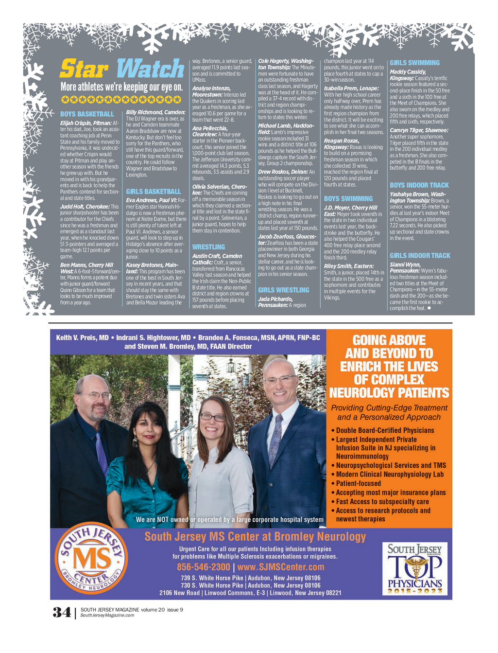 SJM_WinterAthletes_1223FINAL.qxp_Feature 12 / 18 / 23 5 : 31 PM Page 9 way . Bretones , a senior guard , Cole Hagerty , Washing - champion last year at 114 GIRLS SWIMMING averaged 11.9 points last sea - ton Township : The Minute - pounds , this junior went on to Maddy Cassidy , son and is committed to men were fortunate to have place fourth at states to cap a Star Watch Kingsway : Cassidy’s terrific UMass . an outstanding freshman 30 - win season . rookie season featured a sec - class last season , and Hagerty Analyse Intenzo , Isabella Prem , Lenape : More athletes we’re keeping our eye on . ond - place finish in the 50 free was at the head of it . He com - Moorestown : Intenzo led With her high school career and a sixth in the 100 free at piled a 37 - 4 record with dis - the Quakers in scoring last only halfway over , Prem has ? ? ? ? ? ? ? ? ? ? ? ? ? ? the Meet of Champions . She trict and region champi - year as a freshman , as she av - already made history as the also swam on the medley and onships and is looking to re - Billy Richmond , Camden : eraged 10.6 per game for a first region champion from BOYS BASKETBALL 200 free relays , which placed turn to states this winter . The DJ Wagner era is over , as team that went 22 - 8 . the district . It will be exciting fifth and sixth , respectively . Elijah Crispin , Pitman : Af - he and Camden teammate Michael Lamb , Haddon - to see what she can accom - Ana Pellecchia , ter his dad , Joe , took an assis - Camryn Tilger , Shawnee : Aaron Bradshaw are now at field : Lamb’s impressive plish in her final two seasons . Clearview : A four - year tant coaching job at Penn Another super sophomore , Kentucky . But don’t feel too rookie season included 31 starter in the Pioneer back - Reagan Roxas , State and his family moved to Tilger placed fifth in the state sorry for the Panthers , who wins and a district title at 106 court , this senior joined the Kingsway : Roxas is looking Pennsylvania , it was undecid - in the 200 individual medley still have this guard / forward , pounds as he helped the Bull - 1,000 - point club last season . to build on a promising ed whether Crispin would as a freshman . She also com - one of the top recruits in the dawgs capture the South Jer - The Jefferson University com - freshman season in which stay at Pitman and play an - peted in the B finals in the country . He could follow sey , Group 2 championship . mit averaged 14.3 points , 5.3 she collected 31 wins , other season with the friends butterfly and 200 free relay . Wagner and Bradshaw to rebounds , 3.5 assists and 2.9 Drew Roskos , Delran : An reached the region final at he grew up with . But he Lexington . steals . outstanding soccer player 120 pounds and placed moved in with his grandpar - who will compete on the Divi - fourth at states . ents and is back to help the BOYS INDOOR TRACK Olivia Selverian , Chero - sion I level at Bucknell , Panthers contend for section - GIRLS BASKETBALL kee : The Chiefs are coming Yashahya Brown , Wash - Roskos is looking to go out on al and state titles . off a memorable season in BOYS SWIMMING Eva Andrews , Paul VI : For - ington Township : Brown , a a high note in his final which they claimed a section - Judd Holt , Cherokee : This mer Eagles star Hannah Hi - senior , won the 55 - meter hur - J.D . Moyer , Cherry Hill wrestling season . He was a al title and lost in the state fi - junior sharpshooter has been dalgo is now a freshman phe - dles at last year’s indoor Meet East : Moyer took seventh in district champ , region runner - nal by a point . Seleverian , a a contributor for the Chiefs nom at Notre Dame , but there of Champions in a blistering the state in two individual up and placed seventh at junior guard , hopes to help since he was a freshman and is still plenty of talent left at 7.22 seconds . He also picked events last year , the back - states last year at 150 pounds . them stay in contention . emerged as a standout last Paul VI . Andrews , a senior up sectional and state crowns stroke and the butterfly . He Jacob Zearfoss , Glouces - year , when he knocked down guard , will look to step up in in the event . also helped the Cougars ’ ter : Zearfoss has been a state 51 3 - pointers and averaged a Hidalgo’s absence after aver - 400 free relay place second WRESTLING placewinner in both Georgia team - high 12.1 points per aging close to 10 points as a and the 200 medley relay and New Jersey during his GIRLS INDOOR TRACK Austin Craft , Camden game . junior . finish third . stellar career , and he is look - Catholic : Craft , a senior , Sianni Wynn , Ben Manns , Cherry Hill Kasey Bretones , Main - Riley Smith , Eastern : ing to go out as a state cham - transferred from Rancocas Pennsauken : Wynn’s fabu - West : A 6 - foot - 5 forward / cen - land : This program has been Smith , a junior , placed 14th in pion in his senior season . Valley last season and helped lous freshman season includ - ter , Manns forms a potent duo one of the best in South Jer - the state in the 500 free as a the Irish claim the Non - Public ed two titles at the Meet of with junior guard / forward sey in recent years , and that sophomore and contributes B state title . He also earned Champions — in the 55 - meter Quinn Gibson for a team that should stay the same with GIRLS WRESTLING in multiple events for the district and region crowns at dash and the 200 — as she be - looks to be much improved Bretones and twin sisters Ava Vikings . Jada Pichardo , 157 pounds before placing came the first rookie to ac - from a year ago . and Bella Mazur leading the Pennsauken : A region seventh at states . ? complish the feat . SOUTH JERSEY MAGAZINE volume 20 issue 9 SouthJerseyMagazine.com 34 |