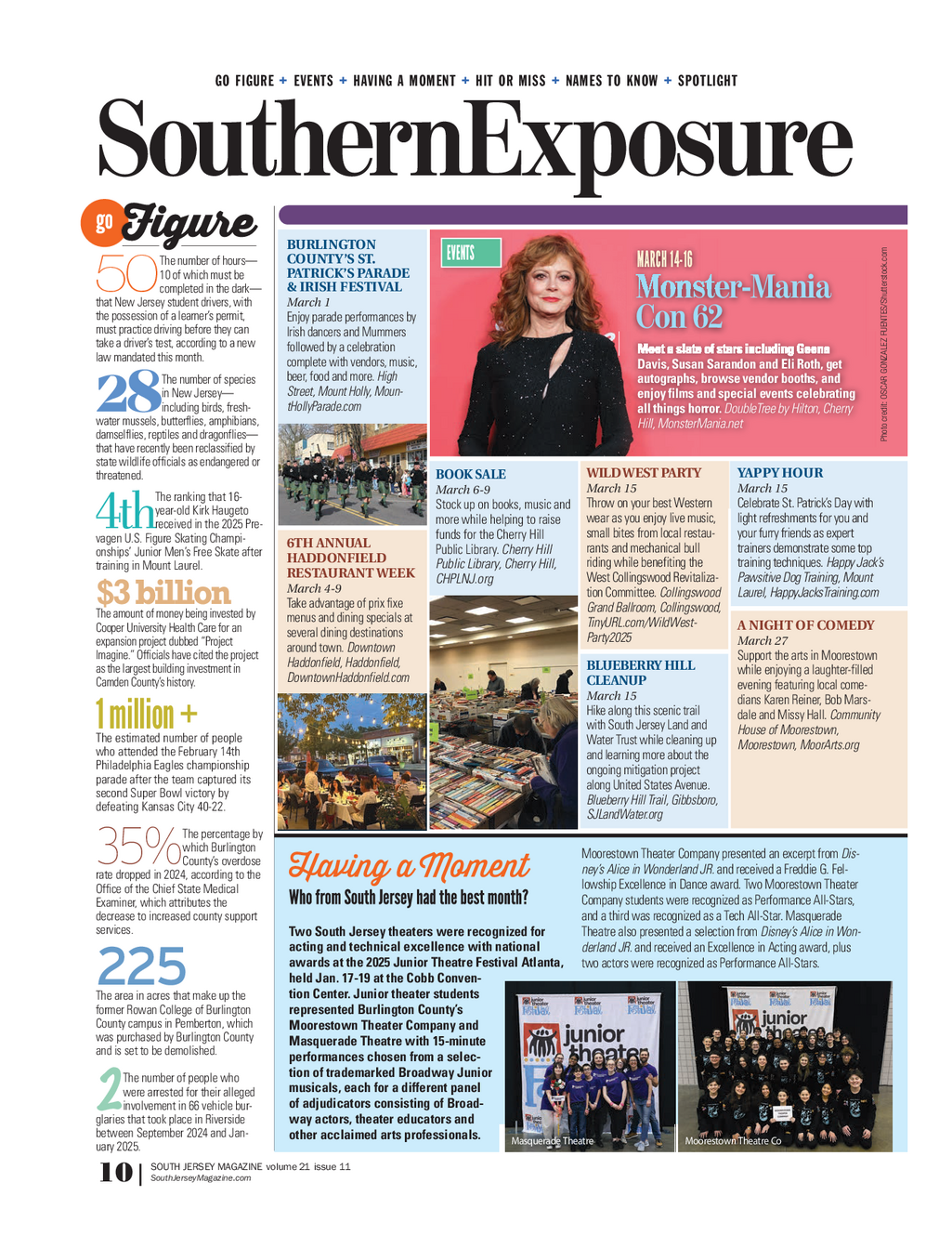 SJM_SouthernExposure_225_SouthernExposure_11_08 2 / 20 / 25 4 : 45 PM Page 1 GO FIGURE + EVENTS + HAVING A MOMENT + HIT OR MISS + NAMES TO KNOW + SPOTLIGHT SouthernExposure BURLINGTON . com EVENTS COUNTY’S ST . Thenumber of hours — tock MARCH 14 - 16 PATRICK’S PARADE 10 of which must be tters 50 & IRISH FESTIVAL completed in the dark — / Shu Monster - Mania that NewJersey student drivers , with March 1 TES thepossession of a learner’s permit , Enjoyparade performances by UEN Con 62 must practice driving before they can F Irish dancersand Mummers EZ take a driver’s test , according to a new L followed by a celebration Meet a slate of stars including Geena ZA lawmandated this month . N completewithvendors , music , Davis , Susan Sarandon and Eli Roth , get GO R beer , foodand more.High autographs , browse vendor booths , and Thenumber of species SCA Street , Mount Holly , Moun - in New Jersey — enjoy films and special events celebrating O it : tHollyParade.com 28including birds , fresh - d all things horror . DoubleTree by Hilton , Cherry cre watermussels , butterflies , amphibians , hoto Hill , MonsterMania.net damselflies , reptiles and dragonflies — P that have recently been reclassified by state wildlife officials as endangered or WILDWEST PARTY YAPPY HOUR BOOK SALE threatened . March 15 March 15 March 6 - 9 The ranking that 16 - Throwon your best Western Celebrate St . Patrick’s Day with Stock up on books , music and year - old Kirk Haugeto wear as you enjoy live music , light refreshments for you and more while helping to raise 4threceived in the 2025 Pre - small bites from local restau - your furry friends as expert funds for the Cherry Hill vagen U.S . Figure Skating Champi - 6TH ANNUAL rants and mechanical bull trainers demonstrate some top Public Library . Cherry Hill onships ’ Junior Men’s Free Skate after HADDONFIELD riding while benefiting the training techniques . Happy Jack’s Public Library , Cherry Hill , training in Mount Laurel . RESTAURANT WEEK WestCollingswood Revitaliza - Pawsitive Dog Training , Mount CHPLNJ.org March 4 - 9 tionCommittee.Collingswood Laurel , HappyJacksTraining.com $ 3billion Takeadvantage of prix fixe GrandBallroom , Collingswood , Theamount of money being invested by menusand dining specials at TinyURL.com / WildWest - A NIGHT OF COMEDY CooperUniversity Health Care for an several dining destinations Party2025 March 27 expansionprojectdubbed “ Project aroundtown . Downtown Imagine . ” Officials have cited the project Support the arts in Moorestown Haddonfield , Haddonfield , BLUEBERRY HILL asthe largest building investment in while enjoying a laughter - filled DowntownHaddonfield.com CLEANUP CamdenCounty’s history . evening featuring local come - March 15 diansKaren Reiner , Bob Mars - Hikealong this scenic trail daleand Missy Hall . Community 1 million + withSouth Jersey Land and House of Moorestown , The estimated number of people Water Trust while cleaning up Moorestown , MoorArts.org who attended the February 14th and learning more about the Philadelphia Eagles championship ongoing mitigation project parade after the team captured its alongUnited States Avenue . second Super Bowl victory by Blueberry Hill Trail , Gibbsboro , defeating Kansas City 40 - 22 . SJLandWater.org The percentage by which Burlington MoorestownTheater Company presented an excerpt from Dis - 35 % County’s overdose ney’s Alice in Wonderland JR . and received a Freddie G . Fel - rate dropped in 2024 , according to the lowshipExcellence in Dance award . Two Moorestown Theater Office of the Chief State Medical Companystudents were recognized as Performance All - Stars , Examiner , which attributes the decrease to increased county support and a third was recognized as a Tech All - Star . Masquerade services . Two South Jersey theaters were recognized for Theatre also presented a selection from Disney’s Alice in Won - acting and technical excellence with national derland JR . and received an Excellence in Acting award , plus awards at the 2025 Junior Theatre Festival Atlanta , two actors were recognized as Performance All - Stars . held Jan . 17 - 19 at the Cobb Conven - 225 tion Center . Junior theater students The area in acres that make up the former Rowan College of Burlington represented Burlington County’s County campus in Pemberton , which Moorestown Theater Company and was purchased by Burlington County Masquerade Theatre with 15 - minute and is set to be demolished . performances chosen from a selec - tion of trademarked Broadway Junior Thenumber of people who musicals , each for a different panel were arrested for their alleged of adjudicators consisting of Broad - 2involvement in 66 vehicle bur - glaries that took place in Riverside way actors , theater educators and between September 2024 and Jan - other acclaimed arts professionals . Masquerade Theatre Moorestown Theatre Co uary 2025 . SOUTH JERSEY MAGAZINE volume 21 issue 11 SouthJerseyMagazine.com 10 |