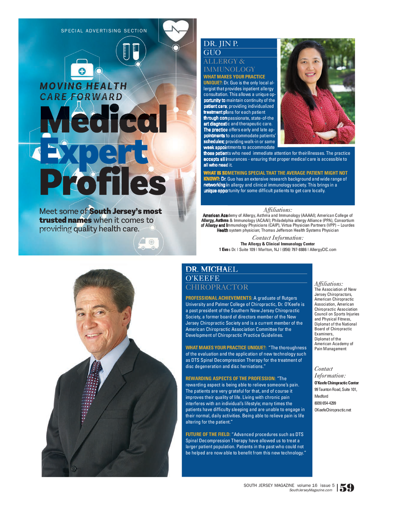 SJM_HC - MedicalGuides_0819 - REG2 . qxp_Pages 7 / 31 / 19 10 : 23 AM Page 1 SPECIAL ADVERTISING SECTION DR . JIN P . GUO ALLERGY & IMMUNOLOGY WHAT MAKES YOUR PRACTICE o UNIQUE ? : is the only local al - Dr . Gu M O V I N G H E A L T H lergist that provides inpatient allergy consultation . This allows a unique op - C A R E F O R W A R D portunity to maintain continuity of the patient care ; providing individualized treatment plans for each patient through compassionate , state - of - the art diagnostic and therapeutic care . The practice offers early and late ap - Medical pointments to accommodate patients ’ schedules ; providing walk - in or same week appointments to accommodate those patients who need immediate attention for theirillnesses . The practice accepts all insurances - ensuring that proper medical care is accessible to Expert all who need it . S SOMETHING SPECIAL THAT THE AVERAGE PATIENT MIGHT NOT WHAT I KNOW ? : Dr . Guo has an extensive research background and wide range of networking in allergy and clinical immunology society . This brings in a unique opportunity for some difficult patients to get care locally . Profiles Affiliations : Meet some of South Jersey’s most American Academy of Allergy , Asthma and Immunology ( AAAAI ) ; American College of Allergy , Asthma & Immunology ( ACAAI ) ; Philadelphia allergy Alliance ( PPA ) , Consortium trusted names when it comes to of Allergy and Immunology Physicians ( CAIP ) , Virtua Physician Partners ( VPP ) – Lourdes providing quality health care . Health system physician ; Thomas Jefferson Health Systems Physician Contact Information : The Allergy & Clinical Immunology Center 1 Eves Dr . | Suite 109 | Marlton , NJ | ( 856 ) 797 - 8886 | AllergyCIC.com DR . MICHAEL O’KEEFE Affiliations : CHIROPRACTOR The Association of New Jersey Chiropractors , PROFESSIONAL ACHIEVEMENTS : A graduate of Rutgers American Chiropractic Association , American University and Palmer College of Chiropractic , Dr . O’Keefe is Chiropractic Association a past president of the Southern New Jersey Chiropractic Council on Sports Injuries Society , a former board of directors member of the New and Physical Fitness , Jersey Chiropractic Society and is a current member of the Diplomat of the National Board of Chiropractic American Chiropractic Association Committee for the Examiners , Development of Chiropractic Practice Guidelines . Diplomat of the American Academy of WHAT MAKES YOUR PRACTICE UNIQUE ? : “ The thoroughness Pain Management of the evaluation and the application of new technology such as DTS Spinal Decompression Therapy for the treatment of disc degeneration and disc herniations . ” Contact Information : REWARDING ASPECTS OF THE PROFESSION : “ The O’Keefe Chiropractic Center rewarding aspect is being able to relieve someone’s pain . 99 Taunton Road , Suite 101 , The patients are very grateful for that , and of course it Medford improves their quality of life . Living with chronic pain ( 609 ) 654 - 4299 interferes with an individual’s lifestyle ; many times the patients have difficulty sleeping and are unable to engage in OKeefeChiropractic.net their normal , daily activities . Being able to relieve pain is life altering for the patient . ” FUTURE OF THE FIELD : “ Advanced procedures such as DTS Spinal Decompression Therapy have allowed us to treat a larger patient population . Patients in the past who could not be helped are now able to benefit from this new technology . ” SOUTH JERSEY MAGAZINE volume 16 issue 5 SouthJerseyMagazine.com | 59