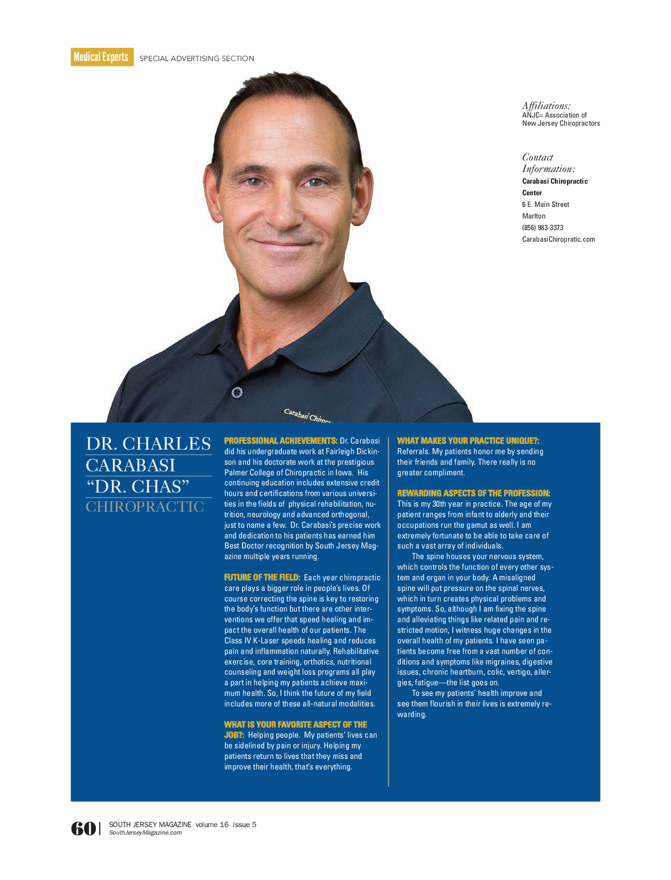 SJM_HC - MedicalGuides_0819 - REG2 . qxp_Pages 7 / 30 / 19 6 : 55 PM Page 2 Medical Experts SPECIAL ADVERTISING SECTION Affiliations : ANJC = Association of New Jersey Chiropractors Contact Information : Carabasi Chiropractic Center 6 E . Main Street Marlton ( 856 ) 983 - 3373 CarabasiChiropratic.com PROFESSIONAL ACHIEVEMENTS : Dr . Carabasi WHAT MAKES YOUR PRACTICE UNIQUE ? : DR . CHARLES did his undergraduate work at Fairleigh Dickin - Referrals . My patients honor me by sending son and his doctorate work at the prestigious their friends and family . There really is no CARABASI Palmer College of Chiropractic in Iowa . His greater compliment . continuing education includes extensive credit “ DR . CHAS ” hours and certifications from various universi - REWARDING ASPECTS OF THE PROFESSION : ties in the fields of physical rehabilitation , nu - This is my 30th year in practice . The age of my CHIROPRACTIC trition , neurology and advanced orthogonal , patient ranges from infant to elderly and their just to name a few . Dr . Carabasi’s precise work occupations run the gamut as well . I am and dedication to his patients has earned him extremely fortunate to be able to take care of Best Doctor recognition by South Jersey Mag - such a vast array of individuals . azine multiple years running . The spine houses your nervous system , which controls the function of every other sys - FUTURE OF THE FIELD : Each year chiropractic tem and organ in your body . A misaligned care plays a bigger role in people’s lives . Of spine will put pressure on the spinal nerves , course correcting the spine is key to restoring which in turn creates physical problems and the body’s function but there are other inter - symptoms . So , although I am fixing the spine ventions we offer that speed healing and im - and alleviating things like related pain and re - pact the overall health of our patients . The stricted motion , I witness huge changes in the Class IV K - Laser speeds healing and reduces overall health of my patients . I have seen pa - pain and inflammation naturally . Rehabilitative tients become free from a vast number of con - exercise , core training , orthotics , nutritional ditions and symptoms like migraines , digestive counseling and weight loss programs all play issues , chronic heartburn , colic , vertigo , aller - a part in helping my patients achieve maxi - gies , fatigue — the list goes on . mum health . So , I think the future of my field To see my patients ’ health improve and includes more of these all - natural modalities . see them flourish in their lives is extremely re - warding . WHAT IS YOUR FAVORITE ASPECT OF THE JOB ? : Helping people . My patients ’ lives can be sidelined by pain or injury . Helping my patients return to lives that they miss and improve their health , that’s everything . SOUTH JERSEY MAGAZINE volume 16 issue 5 SouthJerseyMagazine.com 60 |