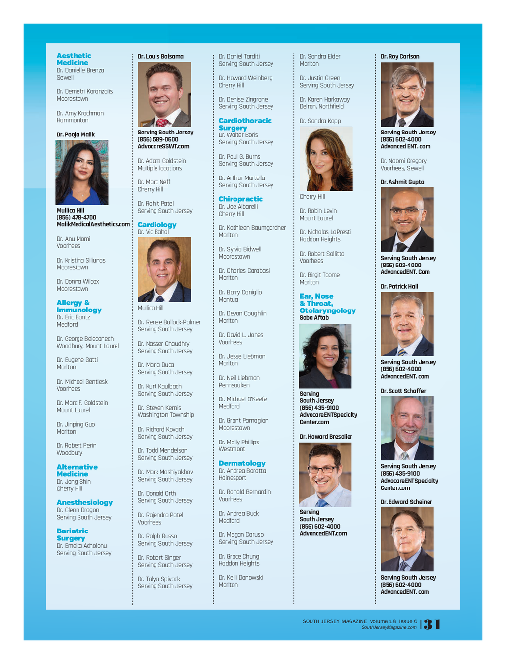 SJM_TopPhysicians0921_Reg1 . qxp_Dept 9 / 23 / 21 3 : 23 PM Page 2 Aesthetic Dr . Louis Balsama Dr . Sandra Elder Dr . Roy Carlson Dr . Daniel Tarditi Medicine Marlton Serving South Jersey Dr . Danielle Brenza Sewell Dr . Justin Green Dr . Howard Weinberg Serving South Jersey Cherry Hill Dr . Demetri Karanzalis Moorestown Dr . Karen Harkaway Dr . Denise Zingrone Delran , Northfield Serving South Jersey Dr . Amy Krachman Hammonton Cardiothoracic Dr . Sandra Kopp Surgery Serving South Jersey Serving South Jersey Dr . Pooja Malik Dr . Walter Boris ( 856 ) 589 - 0600 ( 856 ) 602 - 4000 Serving South Jersey AdvocareSSWT.com Advanced ENT . com Dr . Paul G . Burns Dr . Adam Goldstein Dr . Naomi Gregory Serving South Jersey Multiple locations Voorhees , Sewell Dr . Arthur Martella Dr . Marc Neff Dr . Ashmit Gupta Serving South Jersey Cherry Hill Cherry Hill Chiropractic Dr . Rohit Patel Dr . Joe Albarelli Mullica Hill Serving South Jersey Dr . Robin Levin Cherry Hill ( 856 ) 478 - 4700 Mount Laurel MalikMedicalAesthetics.com Cardiology Dr . Kathleen Baumgardner Dr . Vic Bahal Dr . Nicholas LoPresti Marlton Dr . Anu Momi Haddon Heights Voorhees Dr . Sylvia Bidwell Dr . Robert Sollitto Moorestown Serving South Jersey Dr . Kristina Siliunas Voorhees ( 856 ) 602 - 4000 Moorestown Dr . Charles Carabasi AdvancedENT . Com Dr . Birgit Toome Marlton Dr . Donna Wilcox arlton M Dr . Patrick Hall Moorestown Dr . Barry Coniglio Ear , Nose Mantua Allergy & & Throat , Mullica Hill Immunology Otolaryngology Dr . Devon Coughlin Dr . Eric Bantz Saba Aftab Marlton Dr . Renee Bullock - Palmer Medford Serving South Jersey Dr . David L . Jones Dr . George Belecanech Voorhees Dr . Nasser Chaudhry Woodbury , Mount Laurel Serving South Jersey Dr . Jesse Liebman Dr . Eugene Gatti Serving South Jersey Marlton Dr . Maria Duca Marlton ( 856 ) 602 - 4000 Serving South Jersey AdvancedENT . com Dr . Neil Liebman Dr . Michael Gentlesk Pennsauken Dr . Kurt Kaulbach Voorhees Dr . Scott Schaffer Serving Serving South Jersey Dr . Michael O’Keefe South Jersey Dr . Marc F . Goldstein Medford ( 856 ) 435 - 9100 Dr . Steven Kernis Mount Laurel AdvocareENTSpecialty Washington Township Dr . Grant Parnagian Center.com Dr . Jinping Guo Moorestown Dr . Richard Kovach Marlton Dr . Howard Bresalier Serving South Jersey Dr . Molly Phillips Dr . Robert Perin Westmont Dr . Todd Mendelson Woodbury Serving South Jersey Dermatology Serving South Jersey Alternative Dr . Andrea Baratta Dr . Mark Moshiyakhov ( 856 ) 435 - 9100 Medicine Hainesport Serving South Jersey AdvocareENTSpecialty Dr . Jong Shin Center.com Cherry Hill Dr . Ronald Bernardin Dr . Donald Orth Voorhees Serving South Jersey Dr . Edward Scheiner Anesthesiology Dr . Glenn Dragon Serving Dr . Andrea Buck Dr . Rajendra Patel Serving South Jersey South Jersey Medford Voorhees ( 856 ) 602 - 4000 Bariatric AdvancedENT.com Dr . Megan Caruso Dr . Ralph Russo Surgery Serving South Jersey Serving South Jersey Dr . Emeka Acholonu Serving South Jersey Dr . Grace Chung Dr . Robert Singer Haddon Heights Serving South Jersey Dr . Kelli Danowski Serving South Jersey Dr . Talya Spivack Marlton ( 856 ) 602 - 4000 Serving South Jersey AdvancedENT . com SOUTH JERSEY MAGAZINE volume 18 issue 6 SouthJerseyMagazine.com | 31