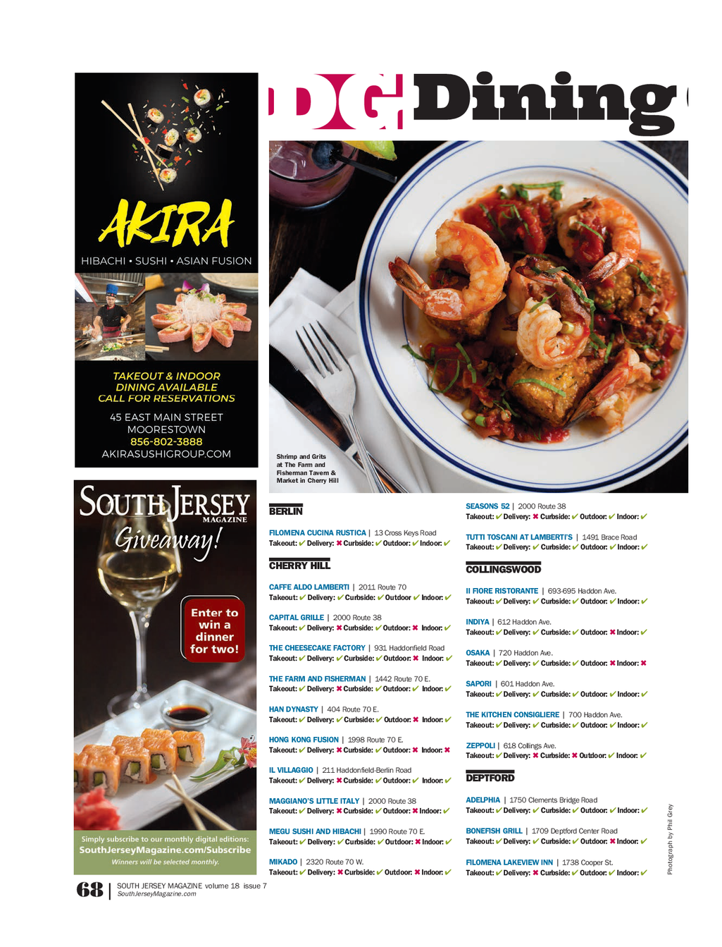 SJM_DiningGuide_10_21_Resized_DiningGuide 10 / 27 / 21 10 : 20 AM Page 1 Shrimp and Grits at The Farm and Fisherman Tavern & Market in Cherry Hill SEASONS 52 | 2000 Route 38 BERLIN Takeout : 4 Delivery : 6 Curbside : 4 Outdoor : 4 Indoor : 4 FILOMENA CUCINA RUSTICA | 13 Cross Keys Road TUTTI TOSCANI AT LAMBERTI’S | 1491 Brace Road Takeout : 4 Delivery : 6 Curbside : 4 Outdoor : 4 Indoor : 4 Takeout : 4 Delivery : 4 Curbside : 4 Outdoor : 4 Indoor : 4 CHERRY HILL COLLINGSWOOD CAFFE ALDO LAMBERTI | 2011 Route 70 II FIORE RISTORANTE | 693 - 695 Haddon Ave . Takeout : 4 Delivery : 4 Curbside : 4 Outdoor 4 Indoor : 4 Takeout : 4 Delivery : 4 Curbside : 4 Outdoor : 4 Indoor : 4 CAPITAL GRILLE | 2000 Route 38 INDIYA | 612 Haddon Ave . Takeout : 4 Delivery : 6 Curbside : 4 Outdoor : 6 Indoor : 4 Takeout : 4 Delivery : 4 Curbside : 4 Outdoor : 6 Indoor : 4 THE CHEESECAKE FACTORY | 931 Haddonfield Road OSAKA | 720 Haddon Ave . Takeout : 4 Delivery : 4 Curbside : 4 Outdoor : 6 Indoor : 4 Takeout : 4 Delivery : 4 Curbside : 4 Outdoor : 6 Indoor : 6 THE FARM AND FISHERMAN | 1442 Route 70 E . SAPORI | 601 Haddon Ave . Takeout : 4 Delivery : 6 Curbside : 4 Outdoor : 4 Indoor : 4 Takeout : 4 Delivery : 4 Curbside : 4 Outdoor : 4 Indoor : 4 HAN DYNASTY | 404 Route 70 E . THE KITCHEN CONSIGLIERE | 700 Haddon Ave . Takeout : 4 Delivery : 4 Curbside : 4 Outdoor : 6 Indoor : 4 Takeout : 4 Delivery : 4 Curbside : 4 Outdoor : 4 Indoor : 4 HONG KONG FUSION | 1998 Route 70 E . ZEPPOLI | 618 Collings Ave . Takeout : 4 Delivery : 6 Curbside : 4 Outdoor : 6 Indoor : 6 Takeout : 4 Delivery : 6 Curbside : 6 Outdoor : 4 Indoor : 4 IL VILLAGGIO | 211 Haddonfield - Berlin Road DEPTFORD Takeout : 4 Delivery : 6 Curbside : 4 Outdoor : 4 Indoor : 4 ADELPHIA | 1750 Clements Bridge Road MAGGIANO’S LITTLE ITALY | 2000 Route 38 rey Takeout : 4 Delivery : 4 Curbside : 4 Outdoor : 4 Indoor : 4 Takeout : 4 Delivery : 6 Curbside : 4 Outdoor : 6 Indoor : 4 G Phil BONEFISH GRILL | 1709 Deptford Center Road MEGU SUSHI AND HIBACHI | 1990 Route 70 E . by Takeout : 4 Delivery : 4 Curbside : 4 Outdoor : 6 Indoor : 4 Takeout : 4 Delivery : 4 Curbside : 4 Outdoor : 6 Indoor : 4 tograph MIKADO | 2320 Route 70 W . FILOMENA LAKEVIEW INN | 1738 Cooper St . ho Takeout : 4 Delivery : 6 Curbside : 4 Outdoor : 6 Indoor : 4 P Takeout : 4 Delivery : 6 Curbside : 4 Outdoor : 4 Indoor : 4 SOUTH JERSEY MAGAZINE volume 18 issue 7 SouthJerseyMagazine.com 68 |