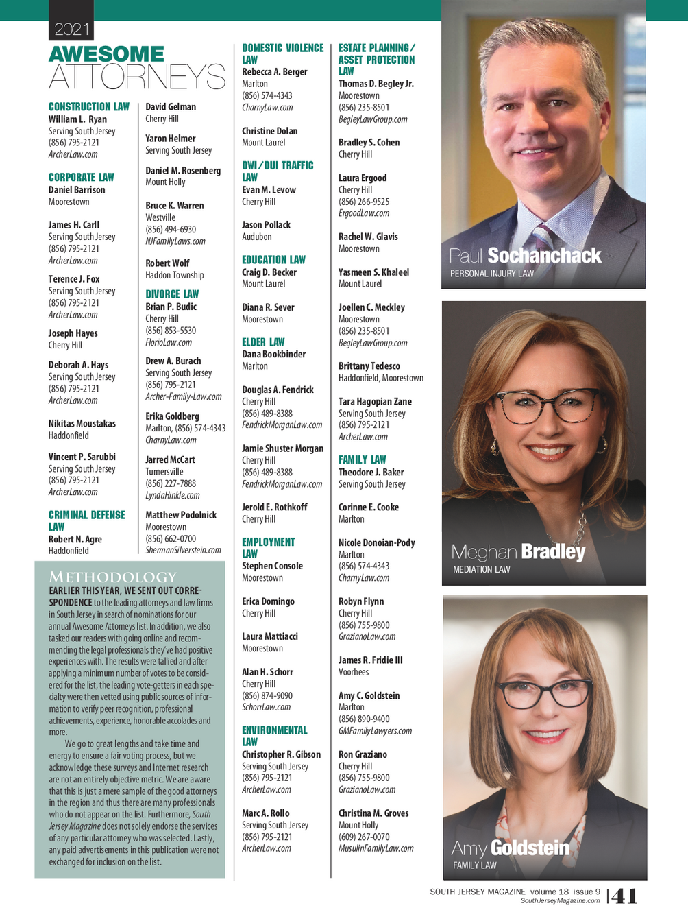 SJM_AwesomeAttorneys_1221 . qxp_SJM Feature 12 / 17 / 21 4 : 50 PM Page 4 2021 Domestic Violence Estate Planning / AWESOME Law Asset Protection Rebecca A . Berger Law Marlton Thomas D . Begley Jr . attorneys ( 856 ) 574 - 4343 Moorestown David Gelman Construction Law CharnyLaw.com ( 856 ) 235 - 8501 Cherry Hill William L . Ryan BegleyLawGroup.com Serving South Jersey ChristineDolan Yaron Helmer ( 856 ) 795 - 2121 Mount Laurel Bradley S . Cohen Serving South Jersey ArcherLaw.com Cherry Hill DWI / DUI Traffic Daniel M . Rosenberg Corporate Law Law LauraErgood Mount Holly Daniel Barrison Evan M . Levow Cherry Hill Moorestown Cherry Hill ( 856 ) 266 - 9525 Bruce K . Warren ErgoodLaw.com Westville James H . Carll Jason Pollack ( 856 ) 494 - 6930 Serving South Jersey Audubon RachelW . Glavis NJFamilyLaws.com ( 856 ) 795 - 2121 Moorestown Paul Sochanchack ArcherLaw.com Education Law Robert Wolf Craig D . Becker Yasmeen S . Khaleel PERSONAL INJURY LAW Terence J . Fox Haddon Township Mount Laurel Mount Laurel Serving South Jersey ( 856 ) 795 - 2121 Divorce Law Diana R . Sever Joellen C . Meckley ArcherLaw.com Brian P . Budic Moorestown Moorestown Cherry Hill ( 856 ) 235 - 8501 JosephHayes ( 856 ) 853 - 5530 ELDER LAW BegleyLawGroup.com Cherry Hill FlorioLaw.com DanaBookbinder Deborah A . Hays Marlton BrittanyTedesco Serving South Jersey Drew A . Burach Haddonfield , Moorestown ( 856 ) 795 - 2121 Serving South Jersey Douglas A . Fendrick ArcherLaw.com ( 856 ) 795 - 2121 Cherry Hill TaraHagopian Zane Archer - Family - Law.com ( 856 ) 489 - 8388 Serving South Jersey Nikitas Moustakas FendrickMorganLaw.com ( 856 ) 795 - 2121 Haddonfield JarredMcCart ArcherLaw.com Turnersville JamieShuster Morgan Vincent P . Sarubbi ( 856 ) 227 - 7888 Cherry Hill Family Law Serving South Jersey LyndaHinkle.com ( 856 ) 489 - 8388 Theodore J . Baker ( 856 ) 795 - 2121 FendrickMorganLaw.com Serving South Jersey ArcherLaw.com MatthewPodolnick Moorestown Jerold E . Rothkoff Corinne E . Cooke Criminal Defense ( 856 ) 662 - 0700 Cherry Hill Marlton Law ShermanSilverstein.com Robert N . Agre Employment NicoleDonoian - Pody Haddonfield Law Marlton MeghanBradley Stephen Console ( 856 ) 574 - 4343 MEDIATION LAW Moorestown CharnyLaw.com Methodology EARLIER THIS YEAR , WE SENT OUT CORRE ? EricaDomingo RobynFlynn SPONDENCEtothe leading attorneys and law firms Cherry Hill Cherry Hill inSouth Jersey in search of nominations for our ( 856 ) 755 - 9800 annualAwesome Attorneys list . In addition , we also LauraMattiacci GrazianoLaw.com taskedour readers with going online and recom - Moorestown mendingthe legal professionals they’ve had positive James R . Fridie III experienceswith . The results were tallied and after Alan H . Schorr Voorhees applying a minimum number of votes to be consid - Cherry Hill ered for the list , the leading vote - getters in each spe - ( 856 ) 874 - 9090 Amy C . Goldstein cialtywere then vetted using public sources of infor - SchorrLaw.com Marlton mation to verify peer recognition , professional ( 856 ) 890 - 9400 achievements , experience , honorable accolades and Environmental GMFamilyLawyers.com more . Law We go to great lengths and take time and Christopher R . Gibson RonGraziano energy to ensure a fair voting process , but we Serving South Jersey Cherry Hill acknowledge these surveys and Internet research ( 856 ) 795 - 2121 ( 856 ) 755 - 9800 are not an entirely objective metric . We are aware ArcherLaw.com GrazianoLaw.com that this is just a mere sample of the good attorneys in the region and thus there are many professionals Marc A . Rollo ChristinaM . Groves who do not appear on the list . Furthermore , South Serving South Jersey Mount Holly JerseyMagazine does not solely endorse the services ( 856 ) 795 - 2121 ( 609 ) 267 - 0070 of any particular attorney who was selected . Lastly , ArcherLaw.com MusulinFamilyLaw.com any paid advertisements in this publication were not AmyGoldstein exchanged for inclusion on the list . FAMILY LAW SOUTH JERSEY MAGAZINE volume 18 issue 9 SouthJerseyMagazine.com | 41