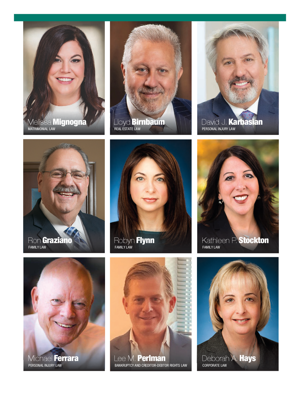 SJM_AwesomeAttorneys_1221 . qxp_SJM Feature 12 / 17 / 21 4 : 50 PM Page 5 Melissa Mignogna Lloyd Birnbaum David J . Karbasian MATRIMONIAL LAW REAL ESTATE LAW PERSONAL INJURY LAW Ron Graziano Robyn Flynn Kathleen P . Stockton FAMILY LAW FAMILY LAW FAMILY LAW Michael Ferrara Lee M . Perlman Deborah A . Hays PERSONAL INJURY LAW BANKRUPTCY AND CREDITOR - DEBTOR RIGHTS LAW CORPORATE LAW