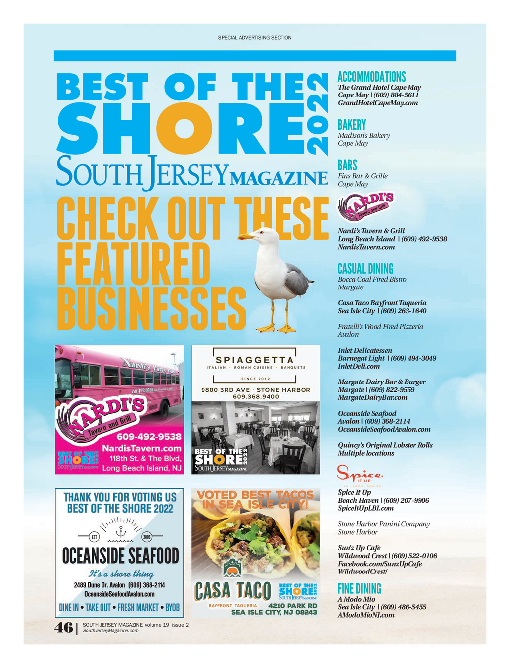 SJM_BestoftheShoreBlocks_5_22_Blocks 5 / 24 / 22 3 : 03 PM Page l SPECIAL ADVERTISING SECTION ACCOMMODATIONS The Grand Hotel Cape May Cape May | ( 609 ) 884 - 5611 GrandHotelCapeMay.com BAKERY Madison’s Bakery Cape May BARS Fins Bar & Grille Cape May Nardi’s Tavern & Grill Long Beach Island | ( 609 ) 492 - 9538 NardisTavern.com CASUAL DINING Bocca Coal Fired Bistro Margate Casa Taco Bayfront Taqueria Sea Isle City | ( 609 ) 263 - 1640 Fratelli’s Wood Fired Pizzeria Avalon Inlet Delicatessen Barnegat Light | ( 609 ) 494 - 3049 InletDeli.com Margate Dairy Bar & Burger Margate | ( 609 ) 822 - 9559 MargateDairyBar.com Oceanside Seafood Avalon | ( 609 ) 368 - 2114 OceansideSeafoodAvalon.com Quincy’s Original Lobster Rolls Multiple locations Spice It Up Beach Haven | ( 609 ) 207 - 9906 SpiceItUpLBI.com Stone Harbor Panini Company Stone Harbor Sun’z Up Cafe Wildwood Crest | ( 609 ) 522 - 0106 Facebook.com / SunzUpCafe WildwoodCrest / FINE DINING A Modo Mio Sea Isle City | ( 609 ) 486 - 5455 AModoMioNJ.com SOUTH JERSEY MAGAZINE volume 19 issue 2 SouthJerseyMagazine.com 46 |