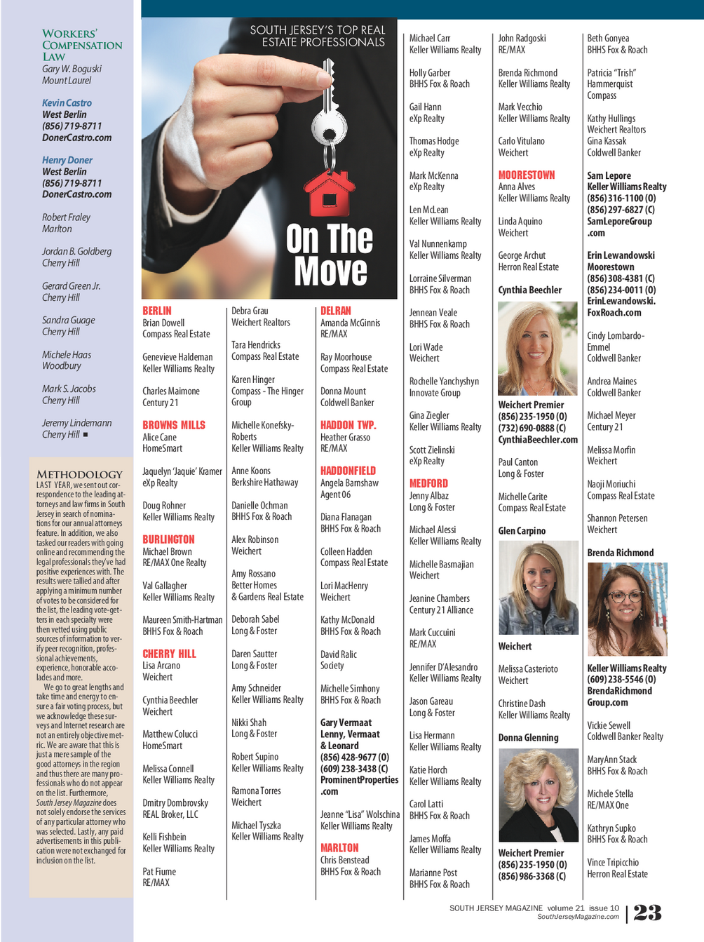 SJM_YearInReview_0125FINAL_REG2 . qxp_2019 1 / 24 / 25 4 : 51 PM Page 4 SOUTH JERSEY’S TOP REAL Workers ’ Michael Carr John Radgoski BethGonyea ESTATE PROFESSIONALS Compensation Keller Williams Realty RE / MAX BHHS Fox & Roach Law Gary W . Boguski HollyGarber BrendaRichmond Patricia “ Trish ” Mount Laurel BHHS Fox & Roach Keller Williams Realty Hammerquist Compass Kevin Castro Gail Hann Mark Vecchio West Berlin eXp Realty Keller Williams Realty Kathy Hullings ( 856 ) 719 - 8711 Weichert Realtors DonerCastro.com ThomasHodge Carlo Vitulano GinaKassak eXp Realty Weichert ColdwellBanker Henry Doner West Berlin Mark McKenna Moorestown SamLepore ( 856 ) 719 - 8711 eXp Realty Anna Alves Keller Williams Realty DonerCastro.com Keller Williams Realty ( 856 ) 316 - 1100 ( O ) Len McLean ( 856 ) 297 - 6827 ( C ) Robert Fraley Keller Williams Realty LindaAquino SamLeporeGroup Marlton Weichert . com Val Nunnenkamp On The Jordan B . Goldberg Keller Williams Realty GeorgeArchut Erin Lewandowski Cherry Hill Herron Real Estate Moorestown Lorraine Silverman ( 856 ) 308 - 4381 ( C ) Move Gerard Green Jr . BHHS Fox & Roach CynthiaBeechler ( 856 ) 234 - 0011 ( O ) Cherry Hill ErinLewandowski . DebraGrau Berlin Delran Jennean Veale FoxRoach.com Sandra Guage Weichert Realtors BrianDowell AmandaMcGinnis BHHS Fox & Roach Cherry Hill Compass Real Estate RE / MAX CindyLombardo - TaraHendricks Lori Wade Emmel Michele Haas Compass Real Estate GenevieveHaldeman Ray Moorhouse Weichert ColdwellBanker Woodbury Keller Williams Realty Compass Real Estate Karen Hinger RochelleYanchyshyn Andrea Maines Mark S . Jacobs Compass - The Hinger CharlesMaimone Donna Mount Innovate Group ColdwellBanker Cherry Hill Group Century 21 Coldwell Banker WeichertPremier Gina Ziegler Michael Meyer ( 856 ) 235 - 1950 ( O ) Jeremy Lindemann MichelleKonefsky - Browns Mills Haddon Twp . Keller Williams Realty Century 21 ( 856 ) 690 - 0888 ( C ) ? Cherry Hill Roberts Alice Cane Heather Grasso CynthiaBeechler.com Keller Williams Realty HomeSmart RE / MAX Scott Zielinski MelissaMorfin eXp Realty Weichert PaulCanton AnneKoons Jaquelyn ‘ Jaquie ’ Kramer Haddonfield Long & Foster Methodology BerkshireHathaway eXp Realty AngelaBarnshaw Medford Naoji Moriuchi LAST YEAR , we sent out cor - respondence to the leading at - Agent 06 Jenny Albaz Compass Real Estate Michelle Carite torneys and law firms in South Danielle Ochman DougRohner Long & Foster Compass Real Estate Jersey in search of nomina - BHHS Fox & Roach Keller Williams Realty Diana Flanagan Shannon Petersen tions for our annual attorneys BHHS Fox & Roach Michael Alessi Weichert GlenCarpino feature . In addition , we also AlexRobinson Burlington Keller Williams Realty taskedourreaders with going Weichert MichaelBrown ColleenHadden online and recommending the BrendaRichmond legalprofessionals they’ve had RE / MAXOne Realty Compass Real Estate Michelle Basmajian positive experiences with . The AmyRossano Weichert resultswere tallied and after BetterHomes Val Gallagher Lori MacHenry applying a minimum number & Gardens Real Estate Keller Williams Realty Weichert Jeanine Chambers ofvotes to be considered for the list , the leading vote - get - Century 21 Alliance ters in each specialty were Deborah Sabel MaureenSmith - Hartman KathyMcDonald thenvetted using public Long & Foster BHHS Fox & Roach BHHS Fox & Roach Mark Cuccuini sources of information to ver - RE / MAX Weichert ify peerrecognition , profes - Daren Sautter Cherry Hill David Ralic sionalachievements , Long & Foster Lisa Arcano Society Jennifer D’Alesandro experience , honorable acco - KellerWilliams Realty Melissa Casterioto ladesand more . Weichert Keller Williams Realty ( 609 ) 238 - 5546 ( O ) Weichert We go to great lengths and AmySchneider MichelleSimhony BrendaRichmond taketimeand energy to en - Keller Williams Realty Cynthia Beechler BHHS Fox & Roach JasonGareau Group.com Christine Dash sure a fair voting process , but Weichert Long & Foster Keller Williams Realty we acknowledge these sur - Nikki Shah GaryVermaat veys and Internet research are Vickie Sewell Long & Foster Matthew Colucci Lenny , Vermaat not an entirely objective met - Lisa Hermann Coldwell Banker Realty DonnaGlenning ric . We are aware that this is HomeSmart & Leonard Keller Williams Realty just a mere sample of the RobertSupino ( 856 ) 428 - 9677 ( O ) MaryAnn Stack good attorneys in the region Keller Williams Realty Melissa Connell ( 609 ) 238 - 3438 ( C ) Katie Horch BHHS Fox & Roach and thus there are many pro - Keller Williams Realty ProminentProperties Keller Williams Realty fessionals who do not appear Ramona Torres . com on the list . Furthermore , Michele Stella South Jersey Magazine does Weichert DmitryDombrovsky Carol Latti RE / MAXOne not solely endorse the services REAL Broker , LLC Jeanne “ Lisa ” Wolschina BHHS Fox & Roach of any particular attorney who Michael Tyszka Keller Williams Realty Kathryn Supko was selected . Lastly , any paid Keller Williams Realty Kelli Fishbein JamesMoffa BHHS Fox & Roach advertisements in this publi - Keller Williams Realty Marlton Keller Williams Realty cation were not exchanged for WeichertPremier inclusion on the list . Chris Benstead Vince Tripicchio ( 856 ) 235 - 1950 ( O ) PatFiume BHHS Fox & Roach Marianne Post Herron Real Estate ( 856 ) 986 - 3368 ( C ) RE / MAX BHHS Fox & Roach SOUTH JERSEY MAGAZINE volume 21 issue 10 SouthJerseyMagazine.com | 23