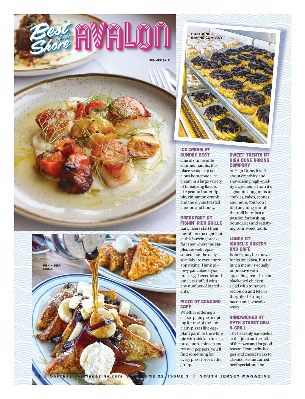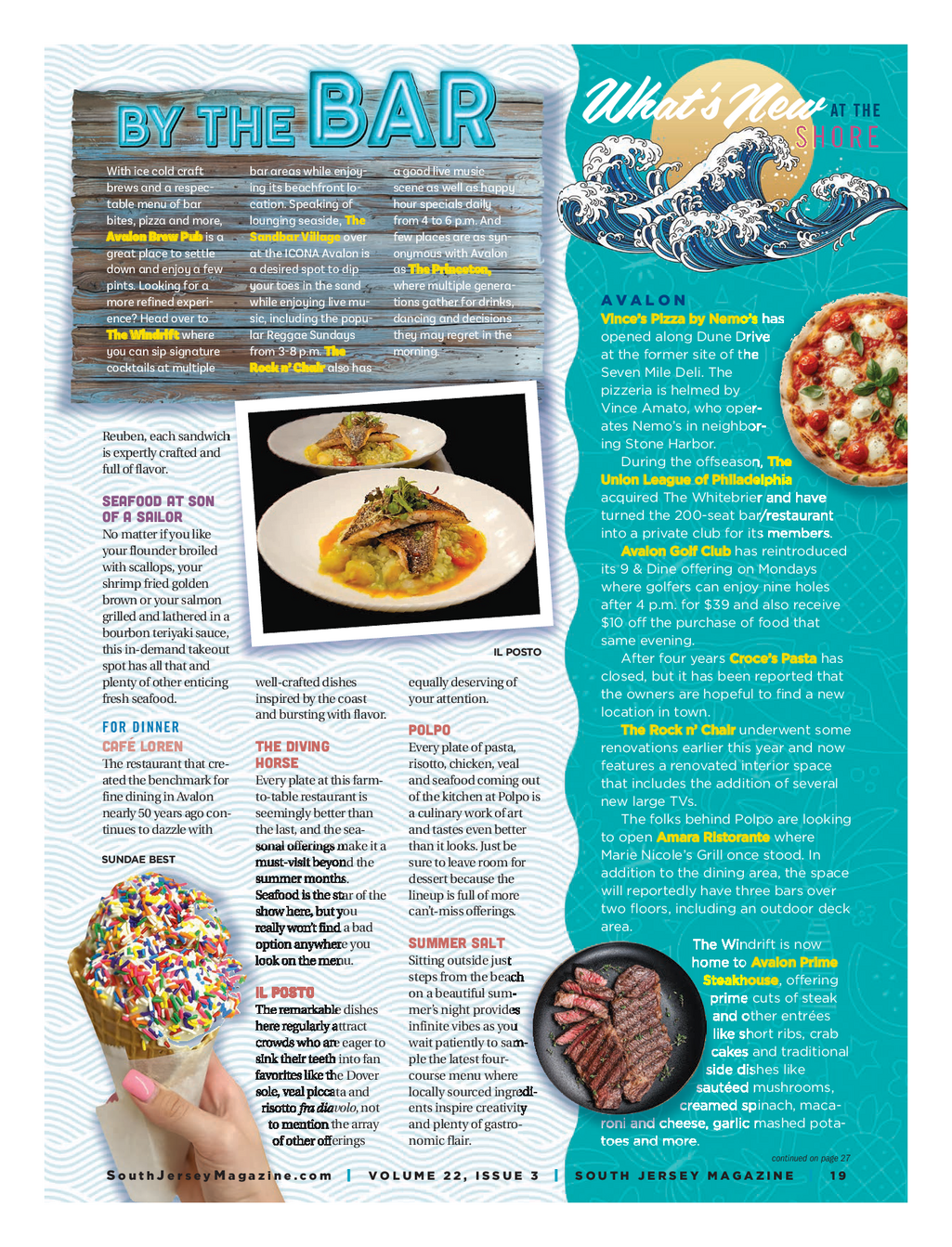 SJM_BestOfTheShore_0625 - FINAL - R1_SJM Feature 6 / 19 / 25 3 : 49 PM Page 4 AT THE hat’s ew W N SHORE With ice cold craft bar areas while enjoy - agood live music brews and a respec - ing its beachfront lo - scene as well as happy table menu of bar cation . Speaking of hour specials daily bites , pizza and more , lounging seaside , The from 4 to 6 p.m . And Avalon Brew Pub is a Sandbar Village over few places are as syn - great place to settle at the ICONA Avalon is onymous with Avalon down and enjoy a few a desired spot to dip asThe Princeton , pints . Looking for a your toes in the sand where multiple genera - AVALON more refined experi - while enjoying live mu - tions gather for drinks , ence ? Head over to sic , including the popu - dancingand decisions Vince’s Pizza by Nemo’s has The Windrift where lar Reggae Sundays theymay regret in the opened along Dune Drive you can sip signature from 3 - 8 p.m . The morning . at the former site of the cocktails at multiple Rock n ’ Chair also has Seven Mile Deli . The pizzeria is helmed by Vince Amato , who oper - ates Nemo’s in neighbor - Reuben , each sandwich ing Stone Harbor . is expertly crafted and During the offseason , The fullof flavor . Union League of Philadelphia acquired The Whitebrier and have SEAFOOD at Son turned the 200 - seat bar / restaurant of a Sailor into a private club for its members . Nomatter if you like your flounder broiled Avalon Golf Club has reintroduced with scallops , your its 9 & Dine offering on Mondays shrimp fried golden where golfers can enjoy nine holes brown or your salmon after 4 p.m . for $ 39 and also receive grilledand lathered in a $ 10 off the purchase of food that bourbonteriyaki sauce , same evening . this in - demand takeout IL POSTO After four years Croce’s Pasta has spothas all that and closed , but it has been reported that plentyof other enticing well - crafteddishes equallydeserving of the owners are hopeful to find a new freshseafood . inspired by the coast yourattention . location in town . and bursting with flavor . FOR DINNER The Rock n ’ Chair underwent some Polpo Café Loren The Diving Every plate of pasta , renovations earlier this year and now The restaurant that cre - Horse risotto , chicken , veal features a renovated interior space ated the benchmark for Everyplate at this farm - andseafood coming out that includes the addition of several fine dining in Avalon to - tablerestaurant is ofthe kitchen at Polpo is new large TVs . nearly50 years ago con - seeminglybetter than aculinary work of art The folks behind Polpo are looking tinuesto dazzle with thelast , and the sea - andtastes even better to open Amara Ristorante where sonalofferings make it a than it looks . Just be Marie Nicole’s Grill once stood . In SUNDAEBEST must - visitbeyond the sureto leave room for addition to the dining area , the space summermonths . dessertbecause the will reportedly have three bars over Seafood is the star of the lineup is full of more two floors , including an outdoor deck showhere , but you can’t - missofferings . area . reallywon’t find a bad option anywhere you Summer Salt The Windrift is now look on the menu . Sitting outside just home to Avalon Prime steps from the beach Steakhouse , offering Il Posto on a beautiful sum - prime cuts of steak Theremarkable dishes mer’snight provides and other entrées hereregularly attract infinitevibes as you like short ribs , crab crowdswho are eager to waitpatiently to sam - cakes and traditional sinktheir teeth into fan plethe latest four - side dishes like favoriteslike the Dover coursemenu where sautéed mushrooms , sole , veal piccata and locallysourced ingredi - creamed spinach , maca - risottofra diavolo , not entsinspire creativity roni and cheese , garlic mashed pota - tomention the array andplenty of gastro - of other offerings nomic flair . toes and more . continued on page 27 SouthJerseyMagazine.com | VOLUME 22 , ISSUE 3 | SOUTH JERSEY MAGAZINE | 19