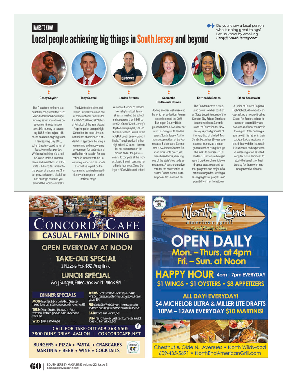 SJM_SouthernExposure_625 - final edits_SouthernExposure_11_08 6 / 19 / 25 1 : 31 PM Page 3 Do you know a local person ? NAMES TO KNOW who is doing great things ? Let us know by emailing Carly @ SouthJersey.com . Local people achieving big things in South Jersey and beyond Casey Snyder Tony Cattani Jordan Strauss Samantha Katrina McCombs Ethan Abramovitz DeAlmeida Roman The Camden native is step - A junior at Eastern Regional Astandout senior on Haddon The Glassboro resident suc - TheMedford resident and Addinganother well - deserved pingdown from her position High School , Abramovitz con - Township’s softball team , cessfully conquered the 2025 Rowan University alum is one honor to her collection , Roman as State Superintendent of the ceptualized a nonprofit called Strausssmashed the school WorldMarathon Challenge , of three national finalists for recently earned the 2025 Camden City School District to Sauna for Seniors , which fo - strikeout record with 562 ca - runningseven marathons on the2025 - 2026 NASSP Nation - BurlingtonCounty Distin - become Assistant Commis - cuses on accessibility and reer Ks . One of South Jersey’s seven continents in seven al Principal of the Year Award . guished Citizens Award for her sioner of Education for New awareness of heat therapy in toptwo - way players , she led days . His journey to travers - As principal of Lenape High work inspiring youth leaders Jersey.A proud graduate of the region . After building a the third - seeded Hawks to the ing 183.3 miles in just 168 School for the past 18 years , acrossSouth Jersey . As the the very district she led , Mc - sauna with his father in their NJSIAASouth Jersey Group 1 hours has been ongoing since Cattanihas championed a stu - youngest president of the As - Combsbegan her 30 - year edu - backyard , Abramovitz com - finals . Though graduating from ThanksgivingDay 2013 , dent - first approach , building a sociated Builders and Contrac - cational journey as a kinder - bined that with his interest in high school , Strauss — known when Snyder vowed to run at welcomingand empowering tors New Jersey Chapter , Ro - garten teacher , rising through life sciences and experience for her dominance on the least two miles per day . environment for students and man represents over 1,400 the ranks to oversee 7,100 volunteering at an assisted moundand at the plate — While maintaining his streak , staff alike . His passion for edu - merit - based firms , directing students.Her tenure brought living facility in Voorhees to yearns to compete at the high - he’s also tackled Ironman cation in tandem with his un - one of the state’s top trade as - record pre - K enrollment , lower study the benefits of heat est level . She will continue her racesand marathons in all 50 wavering leadership has made sociations . A passionate advo - dropout rates , expanded ca - therapy for those with neu - athletic journey at Siena Col - states . A living testament to a formative impact on the cate for the construction in - reer programs and major infra - rodegenerative disease . lege , a NCAA Division I school . the power of endurance , Sny - community , earning him well - dustry , Roman continues to structure upgrades , leaving a der proves that grit , discipline deserved recognition on the empowerthose around her . lasting legacy of progress and and courage can take you national stage . possibility in her hometown . around the world — literally . SOUTH JERSEY MAGAZINE volume 22 issue 3 SouthJerseyMagazine.com 60 |