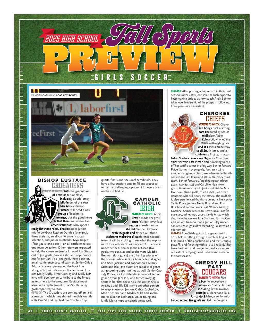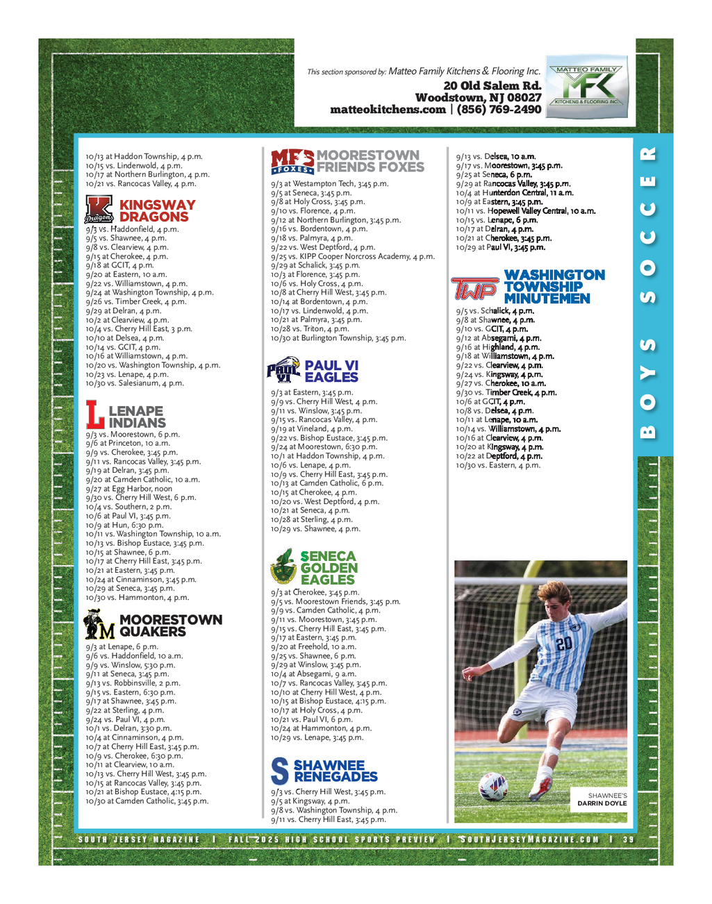 SJM HSSP Boys Soccer 2025 - Evergreen_Layout 1 9 / 5 / 25 12 : 47 PM Page 7 This section sponsored by : Matteo Family Kitchens & Flooring Inc . 20 Old Salem Rd . Woodstown , NJ 08027 matteokitchens.com | ( 856 ) 769 - 2490 10 / 13 at Haddon Township , 4 p.m . 9 / 13 vs . Delsea , 10 a.m . MOORESTOWN R 10 / 15 vs . Lindenwold , 4 p.m . 9 / 17vs . Moorestown , 3 : 45 p.m . FRIENDS FOXES 10 / 17 at Northern Burlington , 4 p.m . 9 / 25 at Seneca , 6 p.m . 10 / 21 vs . Rancocas Valley , 4 p.m . 9 / 3at Westampton Tech , 3 : 45 p.m . 9 / 29 at Rancocas Valley , 3 : 45 p.m . E 9 / 5 at Seneca , 3 : 45 p.m . 10 / 4 at Hunterdon Central , 11 a.m . 9 / 8 at Holy Cross , 3 : 45 p.m . 10 / 9 at Eastern , 3 : 45 p.m . KINGSWAY 9 / 10 vs . Florence , 4 p.m . 10 / 11 vs . Hopewell Valley Central , 10 a.m . C DRAGONS 9 / 12 at Northern Burlington , 3 : 45 p.m . 10 / 15 vs . Lenape , 6 p.m . 9 / 3 vs . Haddonfield , 4 p.m . 9 / 16vs . Bordentown , 4 p.m . 10 / 17 at Delran , 4 p.m . 9 / 5 vs . Shawnee , 4 p.m . 9 / 18 vs . Palmyra , 4 p.m . 10 / 21 at Cherokee , 3 : 45 p.m . C 9 / 8 vs . Clearview , 4 p.m . 9 / 22 vs . West Deptford , 4 p.m . 10 / 29 at Paul VI , 3 : 45 p.m . 9 / 15 at Cherokee , 4 p.m . 9 / 25vs . KIPP Cooper Norcross Academy , 4 p.m . 9 / 18 at GCIT , 4 p.m . 9 / 29 at Schalick , 3 : 45 p.m . O 9 / 20 at Eastern , 10 a.m . 10 / 3 at Florence , 3 : 45 p.m . WASHINGTON 9 / 22 vs . Williamstown , 4 p.m . 10 / 6 vs . Holy Cross , 4 p.m . TOWNSHIP 9 / 24at Washington Township , 4 p.m . 10 / 8 at Cherry Hill West , 3 : 45 p.m . MINUTEMEN S 9 / 26 vs . Timber Creek , 4 p.m . 10 / 14at Bordentown , 4 p.m . 9 / 29 at Delran , 4 p.m . 10 / 17 vs . Lindenwold , 4 p.m . 9 / 5 vs . Schalick , 4 p.m . 10 / 2 at Clearview , 4 p.m . 10 / 21 at Palmyra , 3 : 45 p.m . 9 / 8at Shawnee , 4 p.m . 10 / 4 vs . Cherry Hill East , 3 p.m . 10 / 28 vs . Triton , 4 p.m . 9 / 10 vs . GCIT , 4 p.m . 10 / 10 at Delsea , 4 p.m . 10 / 30 at Burlington Township , 3 : 45 p.m . 9 / 12at Absegami , 4 p.m . 10 / 14 vs . GCIT , 4 p.m . 9 / 16 at Highland , 4 p.m . S 10 / 16 at Williamstown , 4 p.m . 9 / 18 at Williamstown , 4 p.m . 10 / 20 vs . Washington Township , 4 p.m . 9 / 22 vs . Clearview , 4 p.m . PAUL VI 10 / 23 vs . Lenape , 4 p.m . 9 / 24 vs . Kingsway , 4 p.m . Y EAGLES 10 / 30 vs . Salesianum , 4 p.m . 9 / 27 vs . Cherokee , 10 a.m . 9 / 3 at Eastern , 3 : 45 p.m . 9 / 30 vs . Timber Creek , 4 p.m . 9 / 9 vs . Cherry Hill West , 4 p.m . 10 / 6 at GCIT , 4 p.m . O 9 / 11 vs . Winslow , 3 : 45 p.m . 10 / 8 vs . Delsea , 4 p.m . LENAPE 9 / 15 vs . Rancocas Valley , 4 p.m . 10 / 11 at Lenape , 10 a.m . INDIANS 9 / 19 at Vineland , 4 p.m . 10 / 14 vs . Williamstown , 4 p.m . 9 / 3vs . Moorestown , 6 p.m . B 9 / 22 vs . Bishop Eustace , 3 : 45 p.m . 10 / 16 at Clearview , 4 p.m . 9 / 6 at Princeton , 10 a.m . 9 / 24at Moorestown , 6 : 30 p.m . 10 / 20 at Kingsway , 4 p.m . 9 / 9 vs . Cherokee , 3 : 45 p.m . 10 / 1at Haddon Township , 4 p.m . 10 / 22 at Deptford , 4 p.m . 9 / 11 vs . Rancocas Valley , 3 : 45 p.m . 10 / 6 vs . Lenape , 4 p.m . 10 / 30 vs . Eastern , 4 p.m . 9 / 19 at Delran , 3 : 45 p.m . 10 / 9 vs . Cherry Hill East , 3 : 45 p.m . 9 / 20at Camden Catholic , 10 a.m . 10 / 13at Camden Catholic , 6 p.m . 9 / 27at Egg Harbor , noon 10 / 15 at Cherokee , 4 p.m . 9 / 30 vs . Cherry Hill West , 6 p.m . 10 / 20 vs . West Deptford , 4 p.m . 10 / 4 vs . Southern , 2 p.m . 10 / 21 at Seneca , 4 p.m . 10 / 6 at Paul VI , 3 : 45 p.m . 10 / 28 at Sterling , 4 p.m . 10 / 9 at Hun , 6 : 30 p.m . 10 / 29vs . Shawnee , 4 p.m . 10 / 11vs . Washington Township , 10 a.m . 10 / 13 vs . Bishop Eustace , 3 : 45 p.m . 10 / 15 at Shawnee , 6 p.m . SENECA 10 / 17 at Cherry Hill East , 3 : 45 p.m . 10 / 21 at Eastern , 3 : 45 p.m . GOLDEN 10 / 24 at Cinnaminson , 3 : 45 p.m . EAGLES 10 / 29 at Seneca , 3 : 45 p.m . 9 / 3 at Cherokee , 3 : 45 p.m . 10 / 30vs . Hammonton , 4 p.m . 9 / 5 vs . Moorestown Friends , 3 : 45 p.m . 9 / 9 vs . Camden Catholic , 4 p.m . 9 / 11 vs . Moorestown , 3 : 45 p.m . MOORESTOWN 9 / 15 vs . Cherry Hill East , 3 : 45 p.m . QUAKERS 9 / 17 at Eastern , 3 : 45 p.m . 9 / 3 at Lenape , 6 p.m . 9 / 20 at Freehold , 10 a.m . 9 / 6 vs . Haddonfield , 10 a.m . 9 / 25vs . Shawnee , 6 p.m . 9 / 9 vs . Winslow , 5 : 30 p.m . 9 / 29 at Winslow , 3 : 45 p.m . 9 / 11 at Seneca , 3 : 45 p.m . 10 / 4at Absegami , 9 a.m . 9 / 13 vs . Robbinsville , 2 p.m . 10 / 7 vs . Rancocas Valley , 3 : 45 p.m . 9 / 15 vs . Eastern , 6 : 30 p.m . 10 / 10 at Cherry Hill West , 4 p.m . 9 / 17 at Shawnee , 3 : 45 p.m . 10 / 15 at Bishop Eustace , 4 : 15 p.m . 9 / 22 at Sterling , 4 p.m . 10 / 17 at Holy Cross , 4 p.m . 9 / 24 vs . Paul VI , 4 p.m . 10 / 21 vs . Paul VI , 6 p.m . 10 / 1 vs . Delran , 3 : 30 p.m . 10 / 24at Hammonton , 4 p.m . 10 / 4 at Cinnaminson , 4 p.m . 10 / 29 vs . Lenape , 3 : 45 p.m . 10 / 7 at Cherry Hill East , 3 : 45 p.m . 10 / 9 vs . Cherokee , 6 : 30 p.m . 10 / 11 at Clearview , 10 a.m . SHAWNEE 10 / 13 vs . Cherry Hill West , 3 : 45 p.m . RENEGADES 10 / 15 at Rancocas Valley , 3 : 45 p.m . 10 / 21 at Bishop Eustace , 4 : 15 p.m . 9 / 3 vs . Cherry Hill West , 3 : 45 p.m . SHAWNEE’S 10 / 30 at Camden Catholic , 3 : 45 p.m . 9 / 5 at Kingsway , 4 p.m . DARRIN DOYLE 9 / 8 vs . Washington Township , 4 p.m . 9 / 11 vs . Cherry Hill East , 3 : 45 p.m . S O U T H J E R S E Y M A G A Z I N E | F A L L 2 0 2 5 H I G H S C H O O L S P O R T S P R E V I E W | S o u t h J e r s e y M a g a z i n e . c o m | 3 9