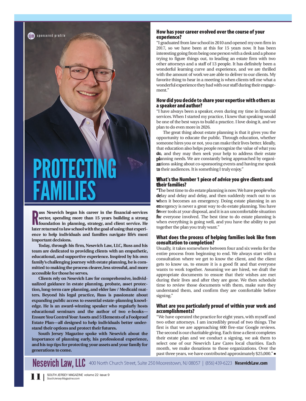 SJM_Nesevich Law_Protecting Families_1225_profile 12 / 18 / 25 12 : 43 PM Page 1 How has your career evolved over the course of your s p o n s o r e d p r o f i l e sjm experience ? “ I graduated from law school in 2010 and opened my own firm in 2017 , so we have been at this for 15 years now . It has been interesting going from being one person with a desk and a phone trying to figure things out , to leading an estate firm with two other attorneys and a staff of 13 people . It has definitely been a wonderful learning curve and experience , and we are thrilled with the amount of work we are able to deliver to our clients . My favorite thing to hear in a meeting is when clients tell me what a wonderful experience they had with our staff during their engage - ment . ” How did you decide to share your expertise with others as a speaker and author ? “ I have always been a speaker , even during my time in financial services . When I started my practice , I knew that speaking would be one of the best ways to build a practice . I love doing it , and we plan to do even more in 2026 . The great thing about estate planning is that it gives you the opportunity to educate the public . Through education , whether someone hires you or not , you can make their lives better . Ideally , that education also helps people recognize the value of what you do , and they may then seek your help to address their estate planning needs . We are constantly being approached by organi - zations asking about co - sponsoring events and having me speak to their audiences . It is something I truly enjoy . ” PROTECTING What's the Number 1 piece of advice you give clients and their families ? “ The best time to do estate planning is now . We have people who delay and delay and delay , and then suddenly reach out to us FAMILIES when it becomes an emergency . Doing estate planning in an emergency is never a great way to do estate planning . You have fewer tools at your disposal , and it is an uncomfortable situation uss Nesevich began his career in the financial - services for everyone involved . The best time to do estate planning is sector , spending more than 15 years building a strong when everything is going well , and you have the ability to put Rfoundation in planning , strategy , and client service . He togetherthe plan you truly want . ” laterreturned to law school with the goal of using that experi - ence to help individuals and families navigate life’s most What does the process of helping families look like from important decisions . consultation to completion ? Today , through his firm , Nesevich Law , LLC , Russ and his Usually , it takes somewhere between four and six weeks for the team are dedicated to providing clients with an empathetic , entire process from beginning to end . We always start with a educational , and supportive experience . Inspired by his own consultation where we get to know the client , and the client family’s challenging journey with estate planning , he is com - gets to know us , to ensure it is a good fit and that everyone mitted to making the process clearer , less stressful , and more wants to work together . Assuming we are hired , we draft the accessible for those he serves . appropriate documents to ensure that their wishes are met Clients rely on Nesevich Law for comprehensive , individ - during their lives and after they are gone . We then schedule ualized guidance in estate planning , probate , asset protec - time to review those documents with them , make sure they tion , long - term care planning , and elder law / Medicaid mat - understand them , and confirm they are comfortable before ters . Beyond his legal practice , Russ is passionate about signing . ” expanding public access to essential estate - planning knowl - edge . He is an award - winning speaker who regularly hosts What are you particularly proud of within your work and accomplishments ? educational seminars and the author of two e - books — “ We have operated the practice for eight years , with myself and EnsureYou Control Your Assets and 5 Elements of a Foolproof two other attorneys . I am incredibly proud of two things . The Estate Plan — all designed to help individuals better under - first is that we are approaching 600 five - star Google reviews . stand their options and protect their futures . The second is our charitable giving . Each time a client completes South Jersey Magazine spoke with Nesevich about the their estate plan and we conduct a signing , we ask them to importance of planning early , his professional experience , select one of our Nesevich Law Cares local charities . Each and his top tips for protecting your assets and your family for month , we make donations to those organizations . Over the generations to come . pastthree years , we have contributed approximately $ 25,000 . ” 400 North Church Street , Suite 250 Moorestown , NJ 08057 | ( 856 ) 439 - 6223 NesevichLaw.com Nesevich Law , LLC SOUTH JERSEY MAGAZINE volume 22 issue 9 SouthJerseyMagazine.com 11 |