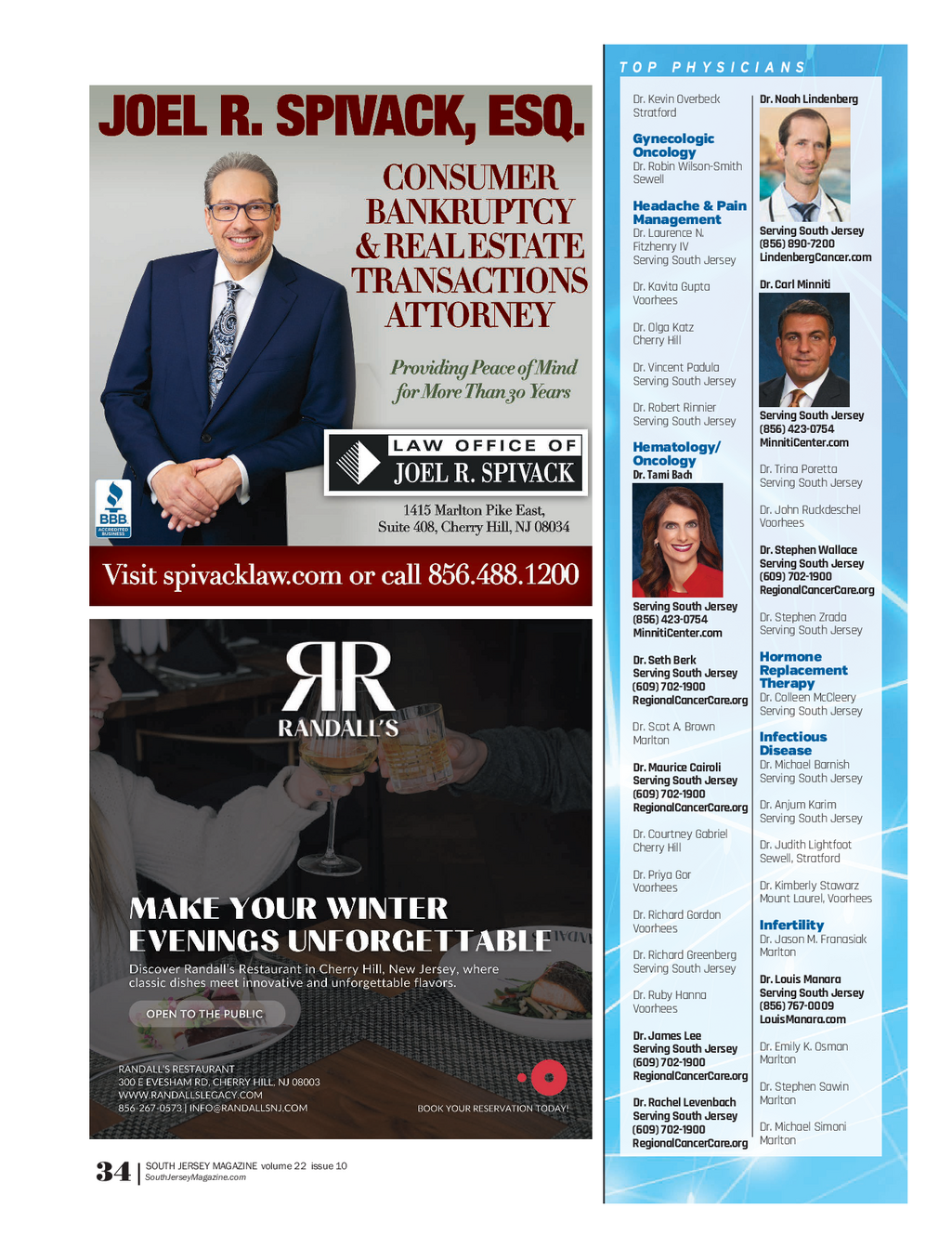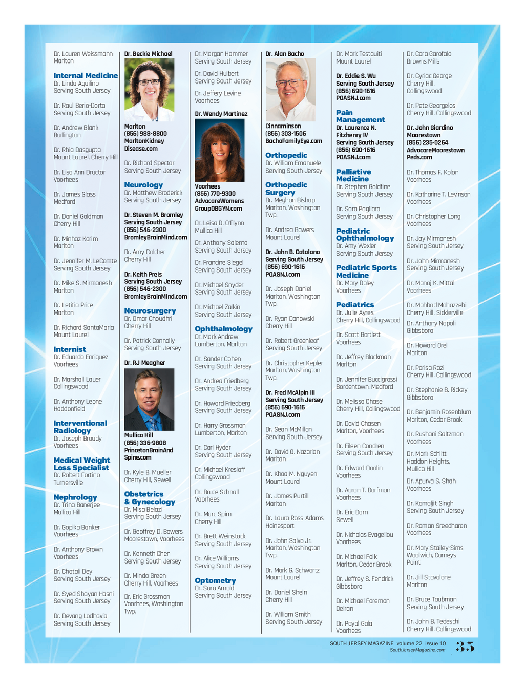 SJM_YearInReview_0126FINAL.qxp_2019 1 / 23 / 26 12 : 48 PM Page 8 Dr . Lauren Weissmann Dr.Beckie Michael Dr . Morgan Hammer Dr.Alan Bacho Dr . Mark Testauiti Dr . Cara Garofalo Marlton ServingSouth Jersey Mount Laurel Browns Mills Dr . David Hulbert Internal Medicine Dr.Eddie S . Wu Dr . Cyriac George ServingSouth Jersey Dr . Linda Aquilino ServingSouth Jersey Cherry Hill , Serving South Jersey ( 856 ) 690 - 1616 Collingswood Dr . Jeffery Levine POASNJ.com Voorhees Dr . Raul Berio - Dorta Dr . Pete Georgelos Serving South Jersey Pain Cherry Hill , Collingswood Dr.Wendy Martinez Management Marlton Cinnaminson Dr . Andrew Blank Dr.Laurence N . Dr.John Giardino ( 856 ) 988 - 8800 ( 856 ) 303 - 1506 Burlington FitzhenryIV Moorestown MarltonKidney BachoFamilyEye.com ServingSouthJersey ( 856 ) 235 - 0264 Disease.com Dr . Rhia Dasgupta ( 856 ) 690 - 1616 AdvocareMoorestown Orthopedic Mount Laurel , Cherry Hill POASNJ.com Peds.com Dr . Richard Spector Dr . William Emanuele Serving South Jersey ServingSouth Jersey Dr . Lisa Ann Dructor Palliative Dr . Thomas F . Kolon Voorhees Medicine Voorhees Neurology Orthopedic Voorhees Dr . Stephen Goldfine Dr . Matthew Broderick Surgery ( 856 ) 770 - 9300 Dr . James Glass ServingSouth Jersey Dr . Katharine T . Levinson ServingSouth Jersey Dr . Meghan Bishop AdvocareWomens Medford Voorhees Marlton , Washington GroupOBGYN.com Dr . Sara Pagliaro Dr.Steven M . Bromley Twp . Dr . Daniel Goldman ServingSouth Jersey Long Dr . Christopher ServingSouth Jersey Dr . Leisa D . O’Flynn Cherry Hill Voorhees ( 856 ) 546 - 2300 Dr . Andrea Bowers Mullica Hill Pediatric BromleyBrainMind.com Mount Laurel Dr . Minhaz Karim Ophthalmology Dr . Jay Mirmanesh Dr . Anthony Salerno Marlton Dr . Amy Wexler ServingSouth Jersey ServingSouth Jersey Dr . Amy Colcher Dr.John B . Catalano Serving South Jersey Cherry Hill ServingSouth Jersey Dr . Jennifer M . LeComte Dr . John Mirmanesh Dr . Francine Siegel ( 856 ) 690 - 1616 ServingSouth Jersey Pediatric Sports ServingSouth Jersey ServingSouth Jersey Dr.Keith Preis POASNJ.com Medicine ServingSouth Jersey Dr . Mike S . Mirmanesh Dr . Mary Daley Dr . Manoj K . Mittal Dr . Michael Snyder ( 856 ) 546 - 2300 Dr . Joseph Daniel Marlton Voorhees Voorhees ServingSouth Jersey BromleyBrainMind.com Marlton , Washington Twp . Dr . Letitia Price Pediatrics Dr . MahbodMohazzebi Dr . Michael Zalkin Neurosurgery Marlton Dr . Julie Ayres Cherry Hill , Sicklerville ServingSouth Jersey Dr . Omar Choudhri Dr . Ryan Danowski Cherry Hill , Collingswood Dr . Anthony Napoli Cherry Hill Cherry Hill Dr . Richard SantaMaria Ophthalmology Gibbsboro Mount Laurel Dr . Scott Bartlett Dr . Mark Andrew Dr . Patrick Connolly Dr . Robert Greenleaf Voorhees Lumberton , Marlton Dr . Howard Orel Serving South Jersey ServingSouth Jersey Internist Marlton Dr . Eduardo Enriquez Dr . Jeffrey Blackman Dr . Sander Cohen Dr.RJ Meagher Dr . Christopher Kepler Voorhees Marlton ServingSouth Jersey Dr . Parisa Razi Marlton , Washington Cherry Hill , Collingswood Twp . Dr . Marshall Lauer Dr . Jennifer Buccigrossi Dr . Andrea Friedberg Collingswood Bordentown , Medford ServingSouth Jersey Dr . Stephanie B . Rickey Dr.Fred McAlpin III Gibbsboro ServingSouth Jersey Dr . Anthony Leone Dr . Melissa Chase Dr . Howard Friedberg ( 856 ) 690 - 1616 Haddonfield Cherry Hill , Collingswood ServingSouth Jersey Dr . Benjamin Rosenblum POASNJ.com Marlton , Cedar Brook Interventional Dr . David Chasen Dr . Harry Grossman Dr . Sean McMillan Radiology Marlton , Voorhees Lumberton , Marlton Dr . RushaniSaltzman Mullica Hill ServingSouth Jersey Dr . Joseph Broudy Voorhees ( 856 ) 336 - 9808 Voorhees Dr . Eileen Condren Dr . Carl Hyder PrincetonBrainAnd Dr . David G . Nazarian ServingSouth Jersey Dr . Mark Schlitt ServingSouth Jersey Spine.com Marlton Medical Weight Haddon Heights , Loss Specialist Dr . Edward Doolin Mullica Hill Dr . Michael Kresloff Dr . Kyle B . Mueller Dr . Khoa M . Nguyen Dr . Robert Fortino Voorhees Collingswood Cherry Hill , Sewell Dr . Apurva S . Shah Mount Laurel Turnersville Voorhees Dr . Aaron T . Dorfman Dr . Bruce Schnall Obstetrics Dr . James Purtill Nephrology Voorhees Voorhees & Gynecology Dr . Kamaljit Singh Marlton Dr . Trina Banerjee Dr . Misa Belazi ServingSouth Jersey Mullica Hill Dr . Eric Dorn Dr . Marc Spirn ServingSouth Jersey Dr . Laura Ross - Adams Sewell Cherry Hill Dr . Raman Sreedharan Hainesport Dr . Gopika Banker Dr . Geoffrey D . Bowers Voorhees Voorhees Dr . Nicholas Evageliou Dr . Brett Weinstock Moorestown , Voorhees Dr . John Salvo Jr . Voorhees ServingSouth Jersey Dr . Mary Stailey - Sims Marlton , Washington Dr . Anthony Brown Dr . Kenneth Chen Woolwich , Carneys Twp . Voorhees Dr . Michael Falk Dr . Alice Williams ServingSouth Jersey Point Marlton , Cedar Brook ServingSouth Jersey Dr . Mark G . Schwartz Dr . Chatali Dey Dr . Minda Green Dr . Jill Stavalone Mount Laurel ServingSouth Jersey Dr . Jeffrey S . Fendrick Optometry Cherry Hill , Voorhees Marlton Gibbsboro Dr . Sara Arnold Dr . Daniel Shein Dr . Syed Shayan Hasni ServingSouth Jersey Dr . Eric Grossman Dr . Bruce Taubman Cherry Hill ServingSouth Jersey Dr . Michael Foreman Voorhees , Washington ServingSouth Jersey Delran Twp . Dr . William Smith Dr . Devang Lodhavia Dr . John B . Tedeschi ServingSouth Jersey ServingSouth Jersey Dr . Payal Gala Cherry Hill , Collingswood Voorhees SOUTH JERSEY MAGAZINE volume 22 issue 10 SouthJerseyMagazine.com | 35