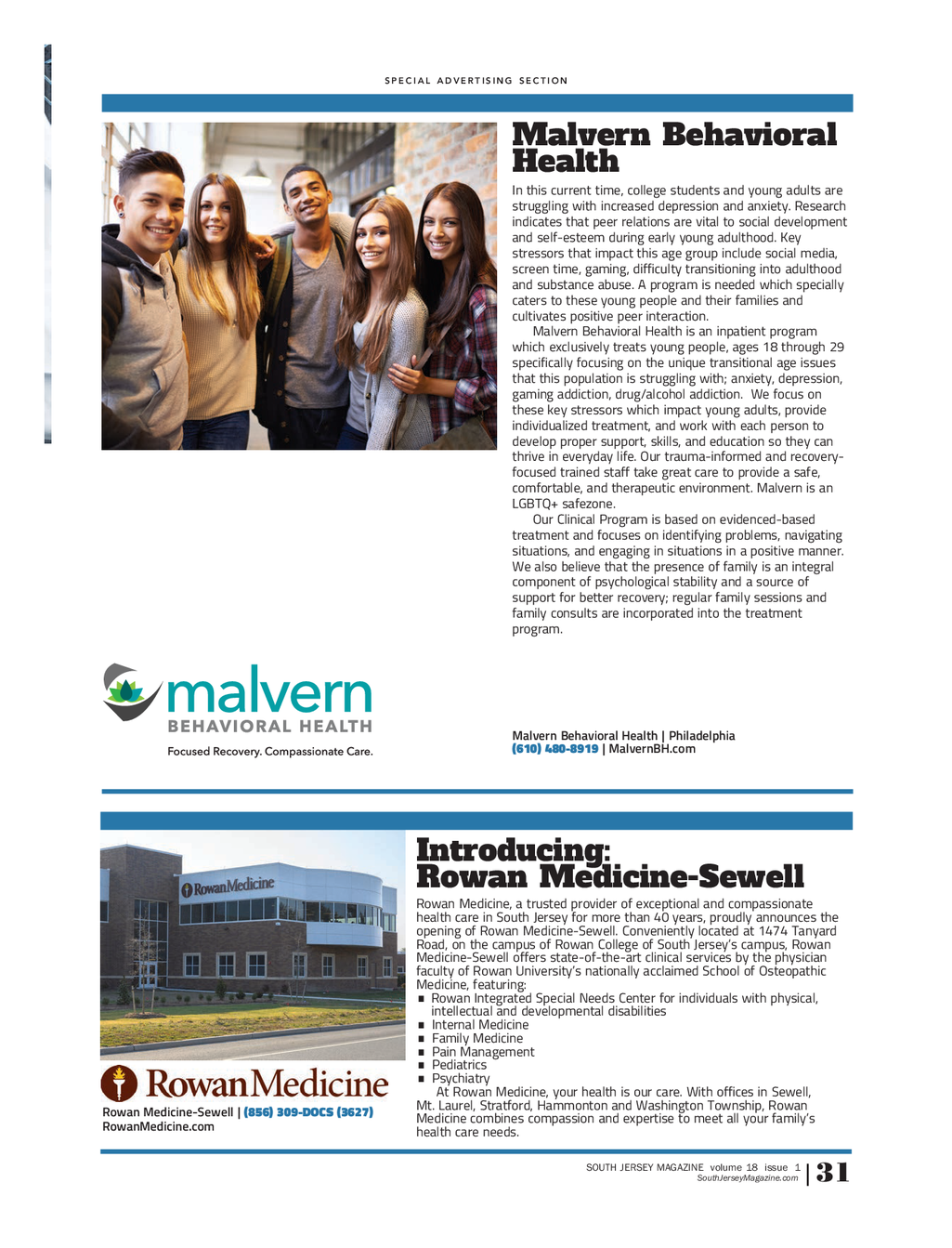 HealthCareProfiles_REG3_4_21 . qxp_RealtorProfile_0319 4 / 8 / 21 6 : 00 PM Page 3 SPECIAL ADVERTISING SECTION Jefferson Outpatient Imaging Jefferson Outpatient Imaging ( JOI ) offers comprehensive imaging in a comfortable , convenient outpatient environment . Serving the South Jersey region in Marlton & Washington Twp . , now there is no need to cross the bridge to access the expertise of Jefferson radiology . JOI offers same and next day appointments , affordable outpatient pricing , fast report turnaround time , and friendly , warm staff who prioritize patient comfort . Our state of the art equipment will ensure that your doctor receives the images they need to accurately diagnose issues and continue your care . Both South Jersey locations offer 3T Wide Bore MRI , arthrography , CT , CT lung screenings , calcium scoring , ultrasound , MSK ultrasound and X - ray . JOI Washington Twp . also offers 3D mammography and DEXA bone density scans . All reports are interpreted by the subspecialized radiologists from Jefferson , who are leaders in their field . To schedule an appointment , call us directly : 215 - 503 - 4900 . For more information , visit JeffersonHealth.org / JOI . Jefferson Outpatient Imaging | Serving South Jersey ( 215 ) 503 - 4900 | JeffersonHealth.org / JOI Make the right choice for your rehabilitation : Kessler Institute One of the nation’s top rehabilitation hospitals , Kessler Institute offers pioneering care at its Marlton campus . Individuals will find the advanced treatment needed to restore their strength , regain their skills and rebuild their lives after a stroke ; brain , spine or other neurologic injuries ; orthopedic trauma , limb loss , cancer and other conditions , including cardiac recovery . Kessler’s rehabilitation specialists provide the proven therapies , innovative technologies and unwavering support to best address each patient’s needs and goals . Studies show that where individuals choose to go for their rehabilitation can make all the difference in their recovery . So make the right choice : Kessler Institute for Rehabilitation . Kessler Institute for Rehabilitation | Marlton ( 856 ) 988 - 8778 | Kessler - Rehab - Marlton.com South Jersey MS Center and TMS Care Center Neuro - Immunology : Where Neurology and Immunology meet . The expanding health care team at the South Jersey MS Center includes Dr . Bromley , Dr . Hightower , Dr . Preis , and Nurse Practitioner Brandee Fonseca . The Center specializes in treating complex neurological conditions involving autoimmune disease , neurodegen - erative disease , neuropsychiatry , infections , and other kinds of nervous system damage . Multiple Sclerosis is the prototypical condition where the immune system attacks the brain and spine , but the center is active in helping patients with CIDP , Myasthenia Gravis , Lupus , Migraine , Dementia , Seizures , Parkinson’s Disease , Lyme , and many others . One cannot treat the mind without the body … and the emphasis on mental health has never been more important . In addition to cutting edge therapies including Intravenous infusions , the center is now adapting Transcranial Magnetic Stimulation ( TMS ) therapy as a non - drug way of treating depression , neuropathic pain , migraine , and even dementia . South Jersey MS Center TMS uses a powerful magnet to regions of the head to deliver electrochemical changes and TMS Care Center ( 856 ) 546 - 2300 in the brain in a very targeted way . SOUTH JERSEY MAGAZINE volume 18 issue 1 SouthJerseyMagazine.com 32 |