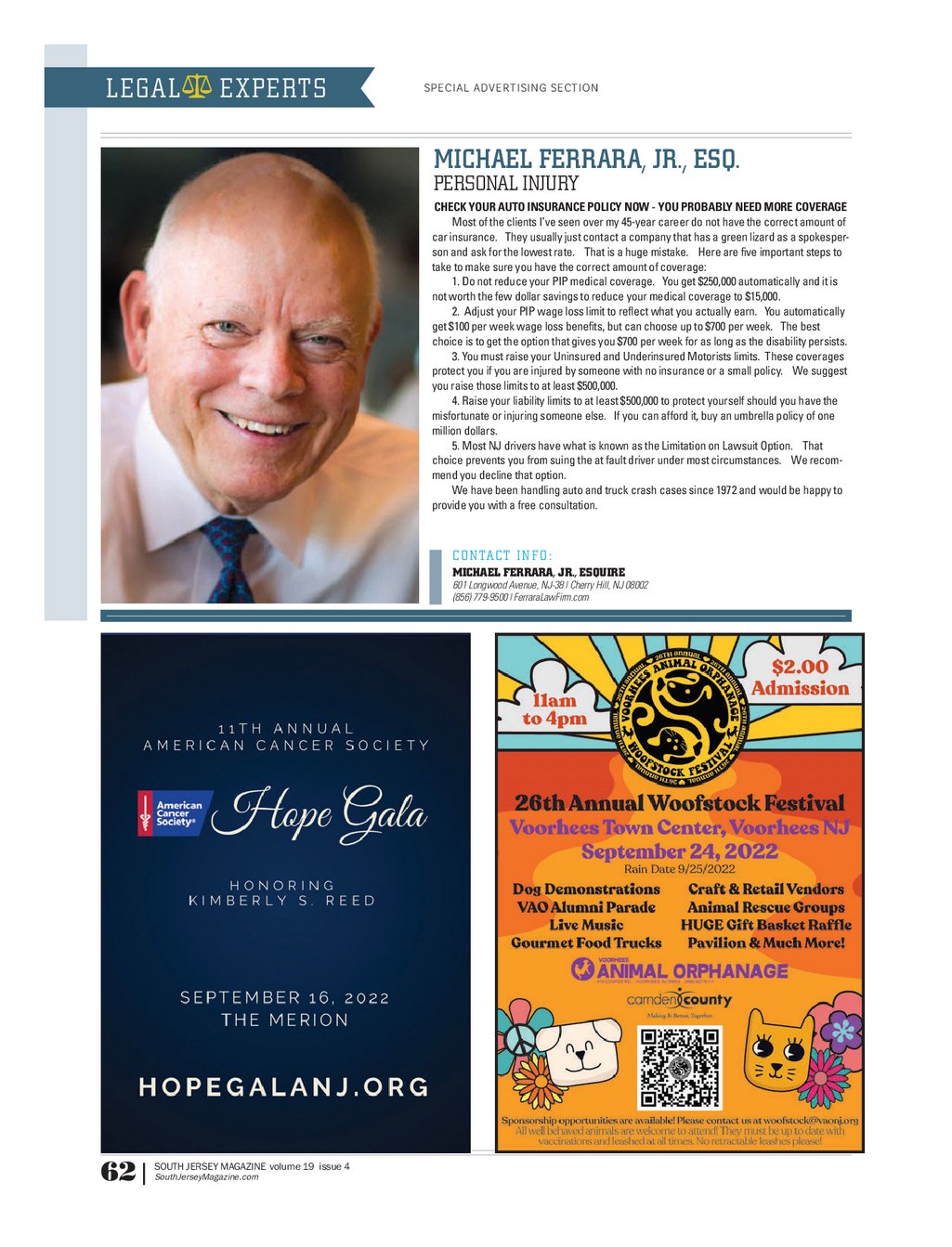 SJM_Legal_ARD_7_22_v3 . qxp_Cancer_7_09 7 / 22 / 22 1 : 15 PM Page 1 SPECIAL ADVERTISING SECTION Law Firm Resource Directory Your guide to attorneys in the South Jersey area . Schorr & Associates , PC CKL Law Group The Law Offices of Sherman & Silverstein Auto & Truck Schorr & Associates Marlton Robert R . Simons Moorestown Accidents exclusively represents ( 856 ) 219 - 2442 Haddon Heights The Ferrara employees in employment Stockton Family Law Law Firm , LLC and unemployment dis - Wolf Law Firm Moorestown CherryHill putes in New Jersey . We Westmont ( 856 ) 779 - 9500 offer a free initial telephone FerraraLawFirm.com Weinberg , Kaplan & consultation . Karbasian Law Divorce & Smith , PA Cherry Hill Dedicated for 30 years in Family Law Bankruptcy Weinberg , Kaplan & Smith ( 856 ) 874 - 9090 helping those injured by Charny , Karpousis , is experienced in divorce , Mark Cherry SchorrLaw.com the negligence of others Altieri & Donoian , P.A custody , mediation , Cherry Hill with honesty , integrity and Charny , Karpousis , Altieri & domestic abuse , appeals , Family Law compassion . Personal Donoian , P.A . is a boutique estate planning , and DCPP . Law Office of Lee Perlman Fridie Law Group injury , auto accidents , slip matrimonial law firm with Every team member is Cherry Hill South Jersey and falls . highly regarded attorneys committed to your best ServingSouth Jersey who provide assertive and interests . Law Office of Joel R . Spivack ( 856 ) 600 - HURT Goldberg & Wolf efficient representation in Marlton Cherry Hill KarbasianLaw.com Cherry Hill all areas of family law , ( 856 ) 795 - 9400 including mediation . WKSNJLaw.com Business Lundy Law Marlton Smedley Law Group Law Serving South Jersey ( 856 ) 574 - 4343 DWI / DUI Law Woodbury Snyderman Law Group , PC CharnyLaw.com Law Offices of Cherry Hill Full Service Malamut & Associates , LLC Jason Pollack , Esq . Law Firm Cherry Hill Audubon Davis & Mendelson , LLC Class Action Law Archer Law Voorhees DeNittis Osefchen SSN and Elder Law Haddonfield Prince , PC Disability Law DeLorenzo Bradley The firm handles complex Offit Kurman Bross and Frankel , P.A . & Banfe , LLC litigation in New Jersey , Serving South Jersey For more than 30 years , Moorestown Pennsylvania and New Begley Law Group Bross and Frankel have York , handling matters Begley Law Group helps helped the tri - state area Stark & Stark ranging from high profile Florio Perrucci Steinhardt seniors , the disabled and with their disability needs . Stark & Stark offers a full national class actions to & Capelli , LLC their families make CherryHill suite of legal services for catastrophic personal Cherry Hill informed choices by ( 856 ) 795 - 8880 businesses and individuals injury cases . guiding them through life’s BrossFrankel.com in New Jersey , Pennsyl - Multiplelocations important decisions and Goldstein & vania , New York , and ( 856 ) 797 - 9951 working to protect their Mignogna , P.A . Workers ’ throughout the United DeNittisLaw.com legacy . Marlton Compensation States . ServingSouthJersey ( 856 ) 890 - 9400 Marlton Doner & Castro Law Corporate Law ( 856 ) 235 - 8501 GMFamilyLawyers.com ( 800 ) 53 - LEGAL South Jersey Capehart Scatchard BegleyLawGroup.com Stark - Stark.Com Mount Laurel Hoffman Law Firm Goldberg & Wolf Turnersville Land Use Law Cherry Hill Lauletta Birnbaum , LLC Marmero Law Sewell Musulin Law Firm , LLC Woodbury Fendrick Morgan , LLC Christopher Musulin , CherryHill Moustakas Nelson LLC founding partner , with over Nursing ( 856 ) 489 - 8388 Haddonfield 34 years of experience and Home Law FendrickMorganLaw.com ( 856 ) 772 - 7801 an AV - rating by Martindale Victoria A . Schall Hubbell , along with Cherry Hill Rothkoff Law Group Criminal Christina Groves , Esq . , Cherry Hill Defense Law partner , who has 14 years Personal of experience , are dedicated Agre & St . John Injury Law Employment Law to all matters regarding Haddonfield Andres & Berger Javerbaum Wurgaft Hicks matrimonial and family Haddonfield Kahn Wickstrom law — litigation , negotia - Gelman Law & Sinins , PC tions and / or mediation . Cherry Hill Voorhees Theodore Baker Law MountHolly Moorestown ( 609 ) 267 - 0070 MusulinFamilyLaw.com SOUTH JERSEY MAGAZINE volume 19 issue 4 SouthJerseyMagazine.com ? ? | ? 61
