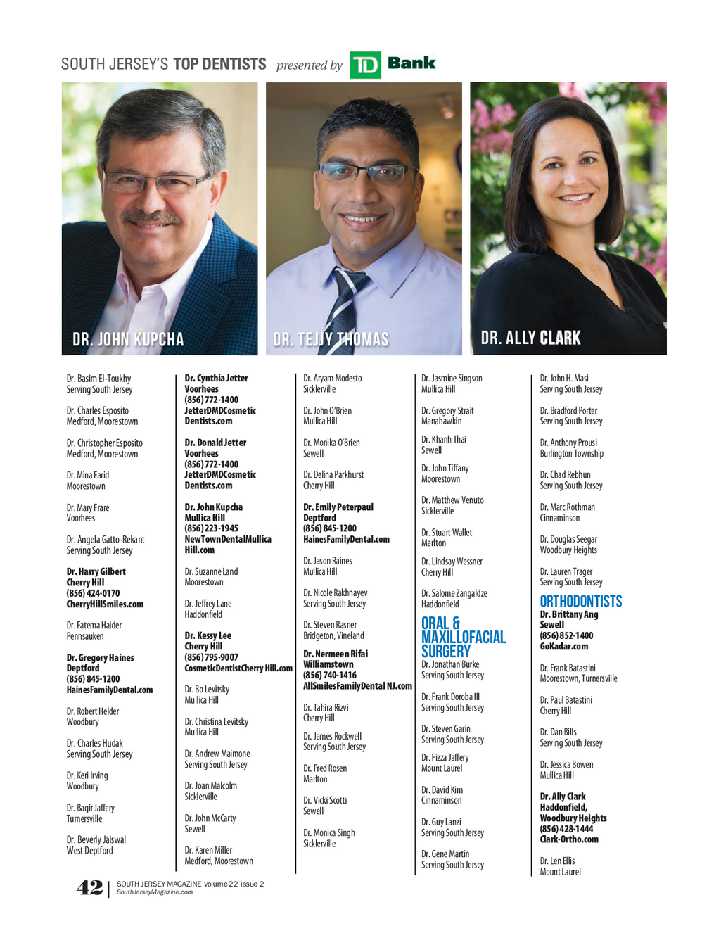 SJM_TopDentists_0525_Reg 3 & 4FINAL.qxp_SJM Spread 5 / 19 / 25 1 : 54 PM Page 3 SOUTH JERSEY’S TOP DENTISTS presented by DR . ALLY CLARK DR . JOHN KUPCHA DR . TEJJY THOMAS Dr . Cynthia Jetter Dr . Aryam Modesto Dr . Jasmine Singson Dr . John H . Masi Dr . Basim El - Toukhy Voorhees Sicklerville Mullica Hill Serving South Jersey Serving South Jersey ( 856 ) 772 - 1400 JetterDMDCosmetic Dr . John O’Brien Dr . Gregory Strait Dr . Bradford Porter Dr . Charles Esposito Dentists.com Mullica Hill Manahawkin Serving South Jersey Medford , Moorestown Dr . Khanh Thai Dr . Donald Jetter Dr . Monika O’Brien Dr . Anthony Prousi Dr . Christopher Esposito Sewell Voorhees Sewell Burlington Township Medford , Moorestown ( 856 ) 772 - 1400 Dr . John Tiffany JetterDMDCosmetic Dr . Delina Parkhurst Dr . Chad Rebhun Dr . Mina Farid Moorestown Dentists.com Cherry Hill Serving South Jersey Moorestown Dr . Matthew Venuto Dr . John Kupcha Dr . Emily Peterpaul Dr . Marc Rothman Dr . Mary Frare Sicklerville Mullica Hill Deptford Cinnaminson Voorhees ( 856 ) 223 - 1945 ( 856 ) 845 - 1200 Dr . Stuart Wallet NewTownDentalMullica HainesFamilyDental.com Dr . Douglas Seegar Dr . Angela Gatto - Rekant Marlton Hill.com Woodbury Heights Serving South Jersey Dr . Jason Raines Dr . Lindsay Wessner Dr . Suzanne Land Mullica Hill Dr . Lauren Trager Dr . Harry Gilbert Cherry Hill Moorestown Serving South Jersey Cherry Hill Dr . Nicole Rakhnayev ( 856 ) 424 - 0170 Dr . Salome Zangaldze Dr . Jeffrey Lane Serving South Jersey Orthodontists CherryHillSmiles.com Haddonfield Haddonfield Dr . Brittany Ang Dr . Steven Rasner Sewell Dr . Fatema Haider Oral & Dr . Kessy Lee Bridgeton , Vineland ( 856 ) 852 - 1400 Pennsauken Maxillofacial Cherry Hill GoKadar.com Dr . Nermeen Rifai Surgery ( 856 ) 795 - 9007 Dr . Gregory Haines Williamstown Dr . Jonathan Burke CosmeticDentistCherry Hill.com Dr . Frank Batastini Deptford ( 856 ) 740 - 1416 Serving South Jersey Moorestown , Turnersville ( 856 ) 845 - 1200 AllSmilesFamilyDental NJ.com Dr . Bo Levitsky HainesFamilyDental.com Dr . Frank Doroba III Mullica Hill Dr . Paul Batastini Dr . Tahira Rizvi Serving South Jersey Cherry Hill Dr . Robert Helder Cherry Hill Dr . Christina Levitsky Woodbury Dr . Steven Garin Mullica Hill Dr . Dan Bills Dr . James Rockwell Serving South Jersey Serving South Jersey Dr . Charles Hudak Serving South Jersey Dr . Andrew Maimone Serving South Jersey Dr . Fizza Jaffery Serving South Jersey Dr . Jessica Bowen Dr . Fred Rosen Mount Laurel Mullica Hill Dr . Keri Irving Marlton Dr . Joan Malcolm Woodbury Dr . David Kim Sicklerville Dr . Ally Clark Dr . Vicki Scotti Cinnaminson Haddonfield , Dr . Baqir Jaffery Sewell Dr . John McCarty Woodbury Heights Turnersville Dr . Guy Lanzi Sewell ( 856 ) 428 - 1444 Dr . Monica Singh Serving South Jersey Clark - Ortho.com Dr . Beverly Jaiswal Sicklerville Dr . Karen Miller West Deptford Dr . Gene Martin Medford , Moorestown Dr . Len Ellis Serving South Jersey Mount Laurel SOUTH JERSEY MAGAZINE volume22 issue 2 SouthJerseyMagazine.com 42 |