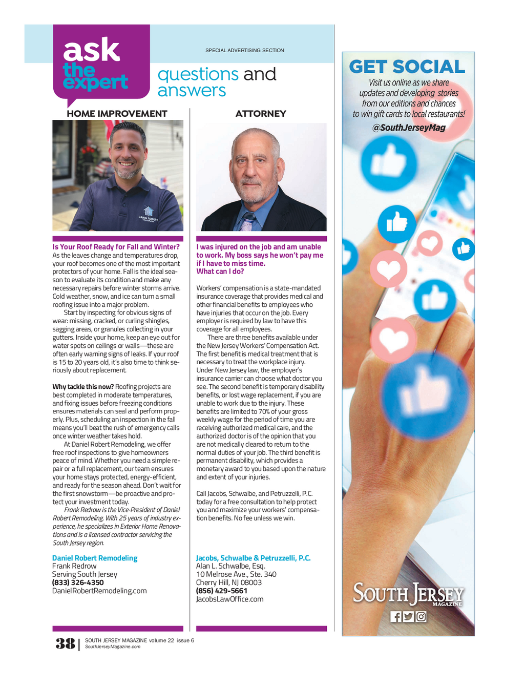 SJM_ATE_9_25_Reg3and4 . qxp_Pages 9 / 19 / 25 10 : 38 AM Page 3 SPECIAL ADVERTISING SECTION ask the questionsand expert answers HOME IMPROVEMENT ATTORNEY Is Your Roof Ready for Fall and Winter ? I was injured on the job and am unable As the leaves change and temperatures drop , to work . My boss says he won’t pay me your roof becomes one of the most important if I have to miss time . protectors of your home . Fall is the ideal sea - What can I do ? son to evaluate its condition and make any necessary repairs before winter storms arrive . Workers’compensation is a state - mandated Cold weather , snow , and ice can turn a small insurancecoverage that provides medical and roofing issue into a major problem . otherfinancial benefits to employees who Start by inspecting for obvious signs of haveinjuries that occur on the job . Every wear : missing , cracked , or curling shingles , employer is required by law to have this sagging areas , or granules collecting in your coveragefor all employees . gutters . Inside your home , keep an eye out for Thereare three benefits available under water spots on ceilings or walls — these are theNew Jersey Workers ’ Compensation Act . often early warning signs The first benefit is medical treatment that is ofleaks . If your roof is 15 to 20 years old , it’s also time to think se - necessaryto treat the workplace injury . riously about replacement . UnderNew Jersey law , the employer’s insurance carrier can choose what doctor you Why tackle this now ? Roofing projects are see.The second benefit is temporary disability best completed in moderate temperatures , benefits , or lost wage replacement , if you are and fixing issues before freezing conditions unableto work due to the injury . These ensures materials can seal and perform prop - benefitsare limited to 70 % of your gross erly . Plus , scheduling an inspection in the fall weeklywage for the period of time you are means you’ll beat the rush of emergency calls receivingauthorized medical care , and the once winter weather takes hold . authorizeddoctor is of the opinion that you At Daniel Robert Remodeling , we offer arenot medically cleared to return to the free roof inspections to give homeowners normalduties of your job . The third benefit is peace of mind . Whether you need a simple re - permanentdisability , which provides a pair or a full replacement , our team ensures monetaryaward to you based upon the nature your home stays protected , energy - efficient , andextent of your injuries . and ready for the season ahead . Don’t wait for the first snowstorm — be proactive and pro - CallJacobs , Schwalbe , and Petruzzelli , P.C . tect your investment today . todayfor a free consultation to help protect Frank Redrow is the Vice - President of Daniel youand maximize your workers ’ compensa - Robert Remodeling . With 25 years of industry ex - tionbenefits . No fee unless we win . perience , he specializes in Exterior Home Renova - tions and is a licensed contractor servicing the South Jersey region . Daniel Robert Remodeling Jacobs , Schwalbe & Petruzzelli , P.C . Frank Redrow Alan L . Schwalbe , Esq . Serving South Jersey 10 Melrose Ave . , Ste . 340 ( 833 ) 326 - 4350 Cherry Hill , NJ 08003 DanielRobertRemodeling.com ( 856 ) 429 - 5661 JacobsLawOffice.com SOUTH JERSEY MAGAZINE volume 22 issue 6 SouthJerseyMagazine.com 38 |