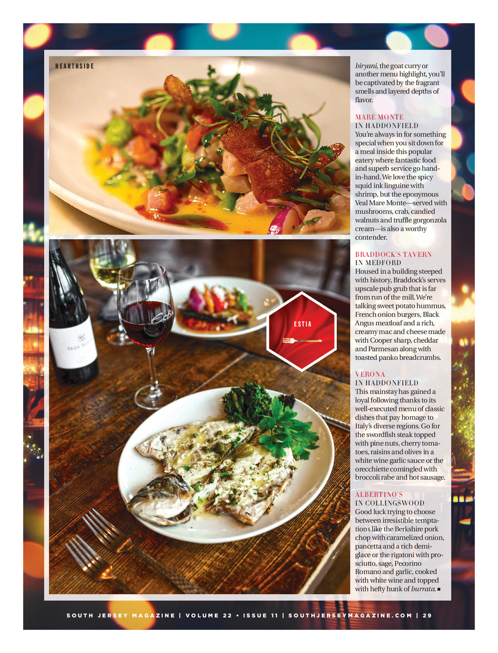 SJM 226 Golden Forks - FINAL_OFM Feature 2 / 18 / 26 4 : 25 PM Page 4 biryani , the goat curry or H E A R T H S I D E another menu highlight , you’ll be captivated by the fragrant smells and layered depths of flavor . MARE MONTE IN HADDONFIELD You’re always in for something special when you sit down for a meal inside this popular eatery where fantastic food and superb service go hand - in - hand . We love the spicy squid ink linguine with shrimp , but the eponymous Veal Mare Monte — served with mushrooms , crab , candied walnuts and truffle gorgonzola cream — is also a worthy contender . BRADDOCK’S TAVERN IN MEDFORD Housed in a building steeped with history , Braddock’s serves upscale pub grub that is far from run of the mill . We’re talking sweet potato hummus , French onion burgers , Black Angus meatloaf and a rich , E S T I A creamy mac and cheese made with Cooper sharp , cheddar and Parmesan along with toasted panko breadcrumbs . VERONA IN HADDONFIELD This mainstay has gained a loyal following thanks to its well - executed menu of classic dishes that pay homage to Italy’s diverse regions . Go for the swordfish steak topped with pine nuts , cherry toma - toes , raisins and olives in a white wine garlic sauce or the orecchiette comingled with broccoli rabe and hot sausage . ALBERTINO’S IN COLLINGSWOOD Good luck trying to choose between irresistible tempta - tions like the Berkshire pork chop with caramelized onion , pancetta and a rich demi - glace or the rigatoni with pro - sciutto , sage , Pecorino Romano and garlic , cooked with white wine and topped with hefty hunk of burrata . S O U T H J E R S E Y M A G A Z I N E | V O L U M E 2 2 • I S S U E 1 1 | S O U T H J E R S E Y M A G A Z I N E . C O M | 2 9