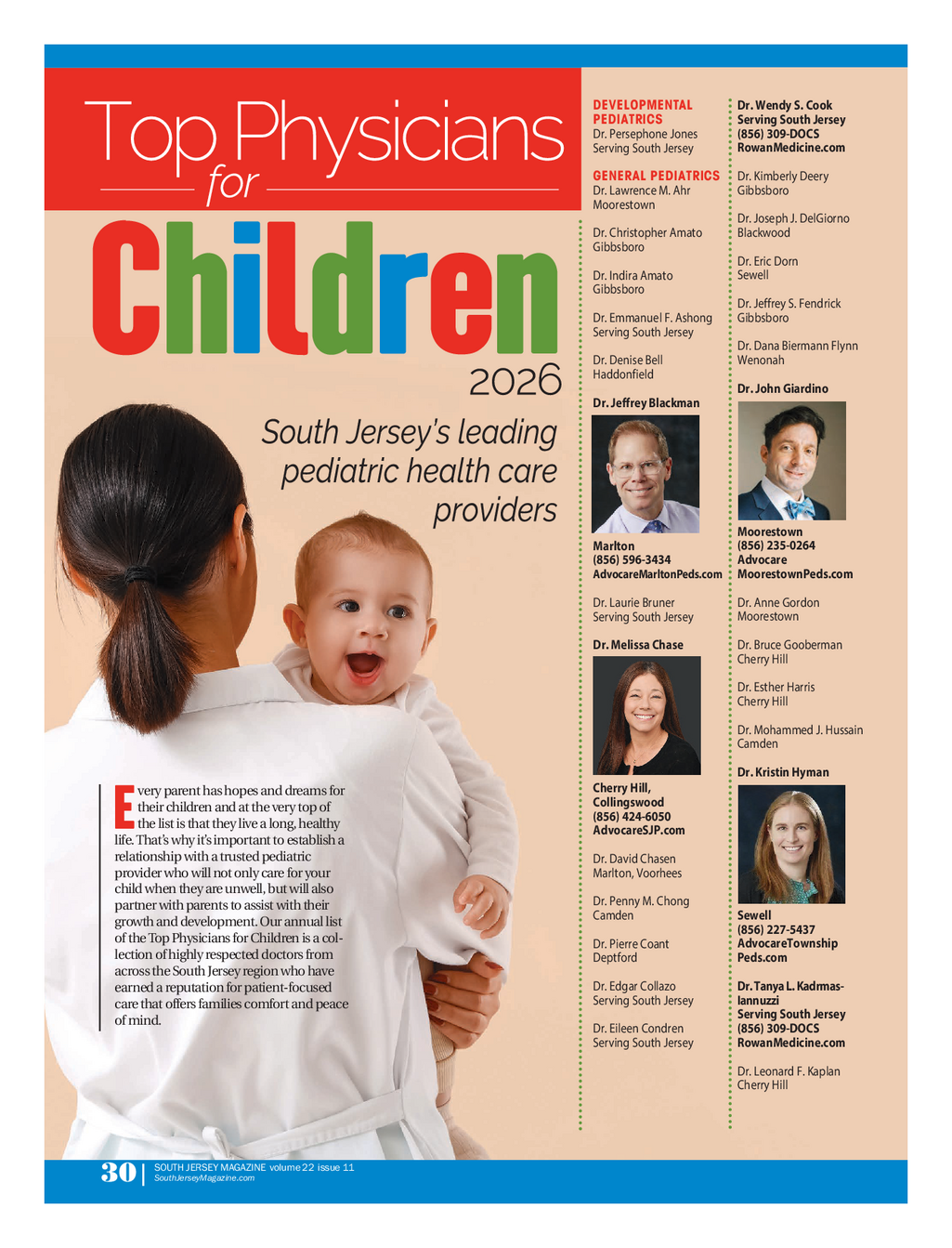 SJM_Top_Physicians_For_Children_0226FINAL.qxp_SJM Spread 2 / 18 / 26 2 : 05 PM Page 1 Dr . Wendy S . Cook DEVELOPMENTAL Serving South Jersey PEDIATRICS ( 856 ) 309 - DOCS Dr . Persephone Jones RowanMedicine.com Serving South Jersey Dr . Kimberly Deery GENERAL PEDIATRICS Gibbsboro Dr . Lawrence M . Ahr Moorestown Dr . Joseph J . DelGiorno Blackwood Dr . Christopher Amato Gibbsboro Dr . Eric Dorn Sewell Dr . Indira Amato Gibbsboro Dr . Jeffrey S . Fendrick Gibbsboro Dr . Emmanuel F . Ashong Serving South Jersey Dr . Dana Biermann Flynn Children Wenonah Dr . Denise Bell Haddonfield Dr . John Giardino Dr . Jeffrey Blackman Moorestown ( 856 ) 235 - 0264 Marlton Advocare ( 856 ) 596 - 3434 MoorestownPeds.com AdvocareMarltonPeds.com Dr . Anne Gordon Dr . Laurie Bruner Moorestown ServingSouth Jersey Dr . Bruce Gooberman Dr.Melissa Chase Cherry Hill Dr . Esther Harris Cherry Hill Dr . Mohammed J . Hussain Camden Dr . Kristin Hyman Cherry Hill , very parent has hopes and dreams for Collingswood their children and at the very top of ( 856 ) 424 - 6050 E the list is that they live a long , healthy AdvocareSJP.com life.That’s why it’s important to establish a relationship with a trusted pediatric Dr . David Chasen provider who will not only care for your Marlton , Voorhees child when they are unwell , but will also Dr . Penny M . Chong partner with parents to assist with their Sewell Camden growth and development . Our annual list ( 856 ) 227 - 5437 of the Top Physicians for Children is a col - AdvocareTownship Dr . Pierre Coant lection of highly respected doctors from Peds.com Deptford across the South Jersey region who have Dr . Tanya L . Kadrmas - Dr . Edgar Collazo earned a reputation for patient - focused Iannuzzi ServingSouth Jersey care that offers families comfort and peace ServingSouth Jersey of mind . ( 856 ) 309 - DOCS Dr . Eileen Condren RowanMedicine.com Serving South Jersey Dr . Leonard F . Kaplan Cherry Hill SOUTH JERSEY MAGAZINE volume 22 issue 11 SouthJerseyMagazine.com 30 |