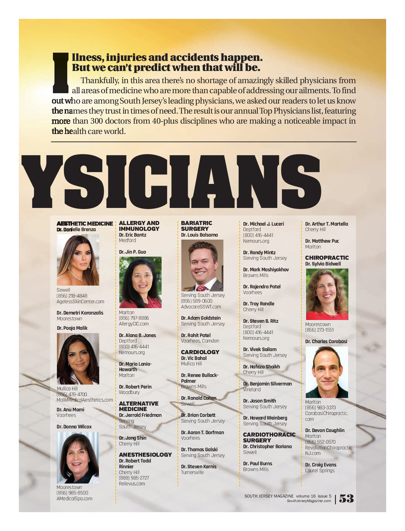 SJM_TopPhysicians0819FINAL_Dept 7 / 30 / 19 7 : 14 PM Page 2 llness , injuries and accidents happen . But we can’t predict when that will be . Thankfully , in this area there’s no shortage of amazingly skilled physicians from I all areas of medicine who are more than capable of addressing our ailments . To find out who are among South Jersey’s leading physicians , we asked our readers to let us know the names they trust in times of need . The result is our annual Top Physicians list , featuring more than 300 doctors from 40 - plus disciplines who are making a noticeable impact in the health care world . HYSICIANS ALLERGY AND BARIATRIC AESTHETIC MEDICINE Dr . Arthur T . Martella Dr . Michael J . Luceri IMMUNOLOGY SURGERY Dr . Danielle Brenza Cherry Hill Deptford Dr . Eric Bantz Dr . Louis Balsama ( 800 ) 416 - 4441 Medford uc P Dr . Matthew Nemours.org Marlton Dr . Jin P . Guo Dr . Randy Mintz CHIROPRACTIC Serving South Jersey Dr . Sylvia Bidwell Dr . Mark Moshiyakhov Browns Mills Dr . Rajendra Patel Sewell Voorhees Serving South Jersey ( 856 ) 218 - 4848 ( 856 ) 589 - 0600 AgelessSkinCenter.com Dr . Troy Randle AdvocareSSWT.com Cherry Hill Marlton Dr . Demetri Karanzalis ( 856 ) 797 - 8886 Dr . Adam Goldstein Moorestown Dr . Steven B . Ritz AllergyCIC.com Serving South Jersey Moorestown Deptford Dr . Pooja Malik ( 856 ) 273 - 1551 ( 800 ) 416 - 4441 Dr . Alana B . Jones Dr . Rohit Patel Nemours.org orhees , Camden Vo Deptford Dr . Charles Carabasi ( 800 ) 416 - 4441 Dr . Vivek Sailam CARDIOLOGY Nemours.org Serving South Jersey Dr . Vic Bahal Mullica Hill Dr . Maria Lania - Dr . Hafeza Shaikh Howarth Cherry Hill Dr . Renee Bullock - Marlton Palmer Dr . Benjamin Silverman Browns Mills Dr . Robert Perin Mullica Hill Vineland Woodbury ( 856 ) 478 - 4700 Dr . Ronald Cohen MalikMedicalAesthetics.com Dr . Jason Smith Marlton ALTERNATIVE Sewell Serving South Jersey ( 856 ) 983 - 3373 MEDICINE Dr . Anu Momi CarabasiChiropractic . Dr . Jerrold Friedman Dr . Brian Corbett Voorhees Dr . Howard Weinberg com Serving Serving South Jersey Serving South Jersey South Jersey Dr . Donna Wilcox Dr . Devon Coughlin Dr . Aaron T . Dorfman CARDIOTHORACIC Marlton Dr . Jong Shin Voorhees SURGERY ( 856 ) 552 - 0570 Cherry Hill Dr . Christopher Bariana RevolutionChiropractic Dr . Thomas Galski Sewell NJ.com ANESTHESIOLOGY Serving South Jersey Dr . Robert Todd Dr . Paul Burns Dr . Craig Evans Rinnier Dr . Steven Kernis Browns Mills Laurel Springs Cherry Hill Turnersville ( 888 ) 985 - 2727 Relievus.com Moorestown ( 856 ) 985 - 8500 SOUTH JERSEY MAGAZINE volume 16 issue 5 AMedicalSpa.com SouthJerseyMagazine.com | 53