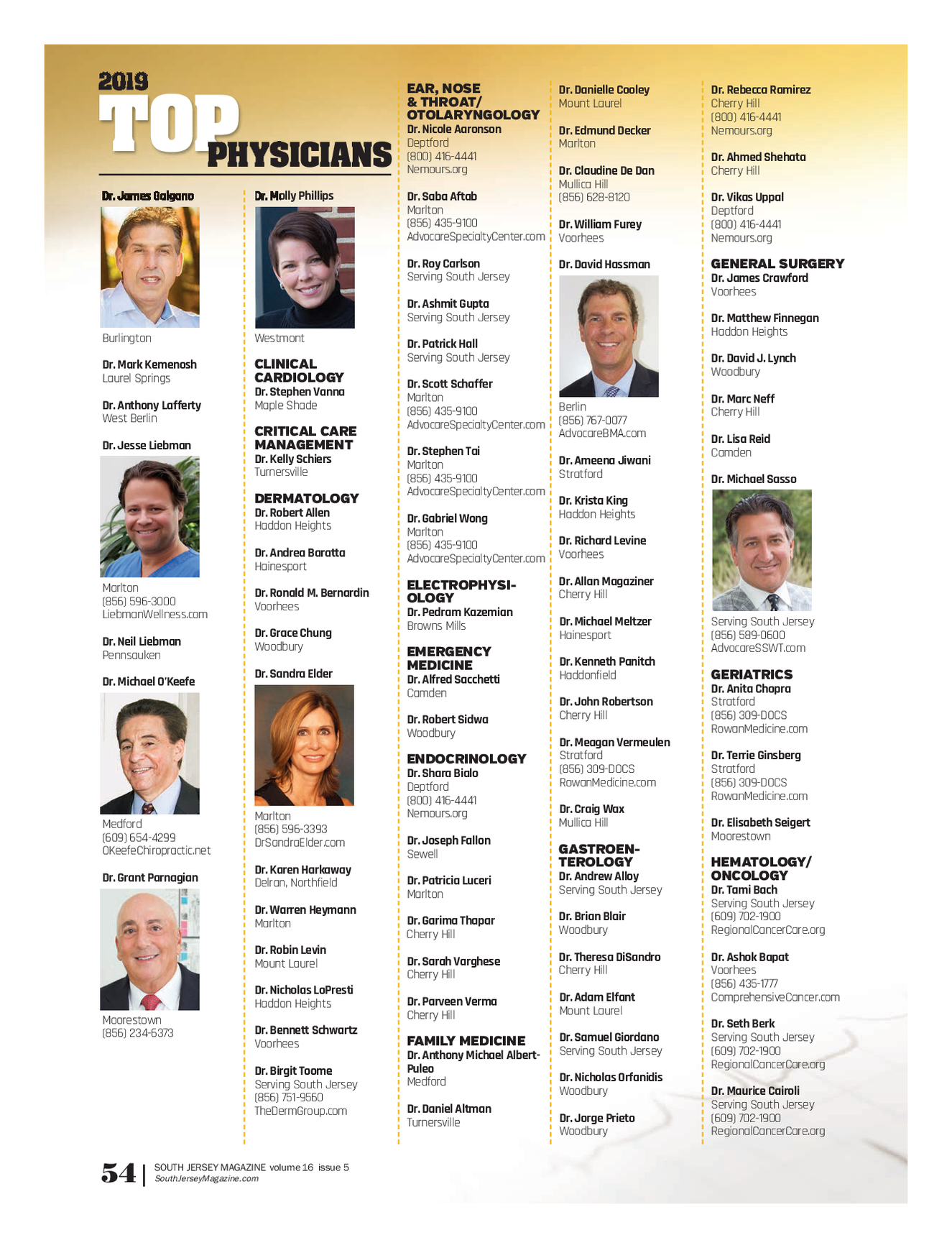 SJM_TopPhysicians0819FINAL_Dept 7 / 30 / 19 7 : 14 PM Page 3 2019 EAR , NOSE Dr . Danielle Cooley Dr . Rebecca Ramirez & THROAT / Mount Laurel Cherry Hill OTOLARYNGOLOGY ( 800 ) 416 - 4441 Dr . Nicole Aaronson Dr . Edmund Decker Nemours.org Deptford Marlton TOP ( 800 ) 416 - 4441 Dr . Ahmed Shehata PHYSICIANS Nemours.org Dr . Claudine De Dan Cherry Hill Mullica Hill Dr . James Galgano Dr . Molly Phillips Dr . Saba Aftab ( 856 ) 628 - 8120 Dr . Vikas Uppal Marlton Deptford ( 856 ) 435 - 9100 Dr . William Furey ( 800 ) 416 - 4441 AdvocareSpecialtyCenter.com Voorhees Nemours.org Dr . Roy Carlson GENERAL SURGERY Dr . David Hassman Serving South Jersey Dr . James Crawford Voorhees Dr . Ashmit Gupta Serving South Jersey Dr . Matthew Finnegan Haddon Heights Burlington Westmont Dr . Patrick Hall Serving South Jersey Dr . David J . Lynch CLINICAL Dr . Mark Kemenosh Woodbury CARDIOLOGY Laurel Springs Dr . Scott Schaffer Dr . Stephen Vanna Marlton Dr . Marc Neff Maple Shade Dr . Anthony Lafferty Berlin ( 856 ) 435 - 9100 Cherry Hill West Berlin ( 856 ) 767 - 0077 AdvocareSpecialtyCenter.com CRITICAL CARE AdvocareBMA.com Dr . Lisa Reid MANAGEMENT Dr . Jesse Liebman Dr . Stephen Tai Camden Dr . Kelly Schiers Dr . Ameena Jiwani Marlton Turnersville Stratford ( 856 ) 435 - 9100 Dr . Michael Sasso AdvocareSpecialtyCenter.com DERMATOLOGY Dr . Krista King Dr . Robert Allen Haddon Heights Dr . Gabriel Wong Haddon Heights Marlton Dr . Richard Levine ( 856 ) 435 - 9100 Dr . Andrea Baratta Voorhees AdvocareSpecialtyCenter.com Hainesport Dr . Allan Magaziner ELECTROPHYSI - Marlton Dr . Ronald M . Bernardin Cherry Hill OLOGY ( 856 ) 596 - 3000 Voorhees Dr . Pedram Kazemian LiebmanWellness.com Serving South Jersey Dr . Michael Meltzer Browns Mills Dr . Grace Chung ( 856 ) 589 - 0600 Hainesport Dr . Neil Liebman Woodbury AdvocareSSWT.com EMERGENCY Pennsauken Dr . Kenneth Panitch MEDICINE Dr . Sandra Elder GERIATRICS Haddonfield Dr . Alfred Sacchetti Dr . Michael O’Keefe Dr . Anita Chopra Camden Stratford Dr . John Robertson ( 856 ) 309 - DOCS Cherry Hill Dr . Robert Sidwa RowanMedicine.com Woodbury Dr . Meagan Vermeulen Dr . Terrie Ginsberg Stratford ENDOCRINOLOGY Stratford ( 856 ) 309 - DOCS Dr . Shara Bialo ( 856 ) 309 - DOCS RowanMedicine.com Deptford RowanMedicine.com ( 800 ) 416 - 4441 Dr . Craig Wax Nemours.org Marlton llica Hill lisabeth Seigert Mu E Dr . Medford ( 856 ) 596 - 3393 Moorestown ( 609 ) 654 - 4299 Dr . Joseph Fallon DrSandraElder.com GASTROEN - OKeefeChiropractic.net Sewell TEROLOGY HEMATOLOGY / Dr . Karen Harkaway Dr . Andrew Alloy ONCOLOGY Dr . Grant Parnagian Dr . Patricia Luceri Delran , Northfield Dr . Tami Bach Serving South Jersey Marlton Serving South Jersey Dr . Warren Heymann ( 609 ) 702 - 1900 Dr . Brian Blair Dr . Garima Thapar Marlton RegionalCancerCare.org Woodbury Cherry Hill Dr . Robin Levin Dr . Ashok Bapat Dr . Theresa DiSandro Dr . Sarah Varghese Mount Laurel Voorhees Cherry Hill Cherry Hill ( 856 ) 435 - 1777 Dr . Nicholas LoPresti ComprehensiveCancer.com Dr . Adam Elfant Dr . Parveen Verma Haddon Heights Mount Laurel Cherry Hill Moorestown Dr . Seth Berk Dr . Bennett Schwartz ( 856 ) 234 - 6373 Serving South Jersey Dr . Samuel Giordano FAMILY MEDICINE Voorhees ( 609 ) 702 - 1900 Serving South Jersey Dr . Anthony Michael Albert - RegionalCancerCare.org Puleo Dr . Birgit Toome Dr . Nicholas Orfanidis Medford Serving South Jersey Dr . Maurice Cairoli Woodbury ( 856 ) 751 - 9560 Serving South Jersey Dr . Daniel Altman TheDermGroup.com ( 609 ) 702 - 1900 Dr . Jorge Prieto Turnersville RegionalCancerCare.org Woodbury SOUTH JERSEY MAGAZINE volume 16 issue 5 SouthJerseyMagazine.com 54 |