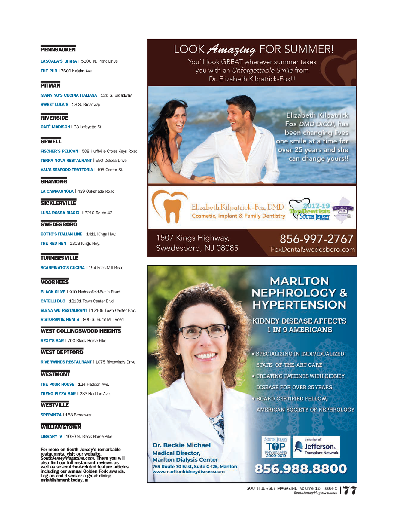 SpecialtyBlocks_SJM_0819 . qxp_Pages 7 / 30 / 19 6 : 29 PM Page 1 PROMOTION Welcome to South Jersey Magazine’s monthly resource guide , your go - to roundup spotlighting top professionals and businesses from across the region . In these pages you’ll find names you should know , names you can trust and names you can count on . Joel R . Sonny Jeffrey Spivack DDS DMD Sekhon , Koslow , Bankruptcy Law Family and Cosmetic 1415 Marlton Pk . East , # 302 Pediatric Dentistry Dentistry Cherry Hill Mt . Laurel ( 856 ) 778 - 0800 Deptford ( 856 ) 488 - 1200 Voorhees ( 856 ) 770 - 1770 ( 856 ) 845 - 1200 spivacklaw.com mygrowingsmile.com timmsandkoslow.com Michele Fred Van Robert J . DMD Paterno , DDS Istendal , Adinolfi Adinolfi , Molotsky , Burick & Falkenstein , P.A . Acorn Dental Divorce & Family Law Orthodontics State - of - the - Art Dentistry Haddonfield Mt . Laurel Marlton ( 856 ) 428 - 8334 ( 856 ) 722 - 5664 ( 856 ) 983 - 0060 sjfamilylawyers.com paternoorthodonticsllc.com acorndental.com Kevin Richard Michael DMD Atlee , MSD Kaye , Berger Orthodontics Andres & Berger Family & Moorestown Cosmetic Dentistry Medical Malpractice & Mt . Holly Moorestown Haddonfield ( 856 ) 234 - 4044 ( 856 ) 234 - 8686 ( 856 ) 795 - 1444 ( 609 ) 267 - 1221 atleedental.com andresberger.com morroneandkaye.com Stephen Lisa Susan Harry J . DeNittis DMD Gallucci , Armstrong , DDS DDS Gilbert , Creating Beautiful Smiles DeNittis Osefchen P.C 24 E . Main St Springdale Family Personal Injury law Marlton Pediatric Dentistry Dental Marlton ( 856 ) 983 - 0546 Moorestown Cherry Hill ( 856 ) 797 - 9951 galluccidental.com ( 856 ) 235 - 04151 ( 856 ) 424 - 0170 denittislaw.com galluccidentalsleep.com armstrongpediatricdental.com cherryhillsmiles.com Richard Fred Philip S . Erin DMD Ruden , DDS Rosen , Burnham II Kazmierski DMD Furno , Innovative Burnham Law Group Technology - Caring Orthodontics Evergreen Dental Divorce & Family Law Environment Marlton , Medford Woodbury Marlton Marlton & Voorhees ( 856 ) 845 - 3299 ( 856 ) 751 - 5505 ( 856 ) 983 - 7732 ( 856 ) 596 - 1933 denture549 . com burnhamlawgroup.com rosendworkin.com kazorthodontics.com Brad Jerold E . David Gary DMD Convissar , Rothkoff DMD DMD Edenbaum , Dworkin , Periodontics & Dental Rancocas Woods Family Rothkoff Law Group Great Smiles Implantology Dentistry Elder Law Begin with Us Voorhees Mt . Laurel Cherry Hill Marlton ( 877 ) 676 - 3336 ( 856 ) 778 - 8655 ( 856 ) 616 - 2923 ( 856 ) 983 - 7732 edendentalspecialists.com rosendworkin.com rancocaswoodsfamilydentistry.com rothkofflaw.com Specialty # 3743 Joseph Christopher R . Mario J . DMD Natoli , DMD Musulin Canal , Periodontics Cosmetic , General Matrimonial Law Moorestown & Implant Dentistry Mount Holly & Medford Turnersville ( 609 ) 267 - 0070 ( 856 ) 439 - 1200 ( 856 ) 262 - 0600 musulinfamilylaw.com canalcalemperio.com natolidental.com Dr . Eric B . Kimberly Mary Ben Grossman Packman DDS Frare , DMD Calem , Stolfe Zeigler Compassionate Obstetrics & Family Law Dental Care Periodontics Gynecology Moorestown Voorhees Medford & Moorestown Voorhees 856 - 812 - 9020 ( 856 ) 772 - 0277 439 - 1200 ( 856 ) ( 856 ) 772 - 2300 www.szfamilylawfirm.com compassionatedentalcare.com canalcalemperio.com advocarepremierobgyn.com SOUTH JERSEY MAGAZINE volume 16 issue 5 SouthJerseyMagazine.com 78 |