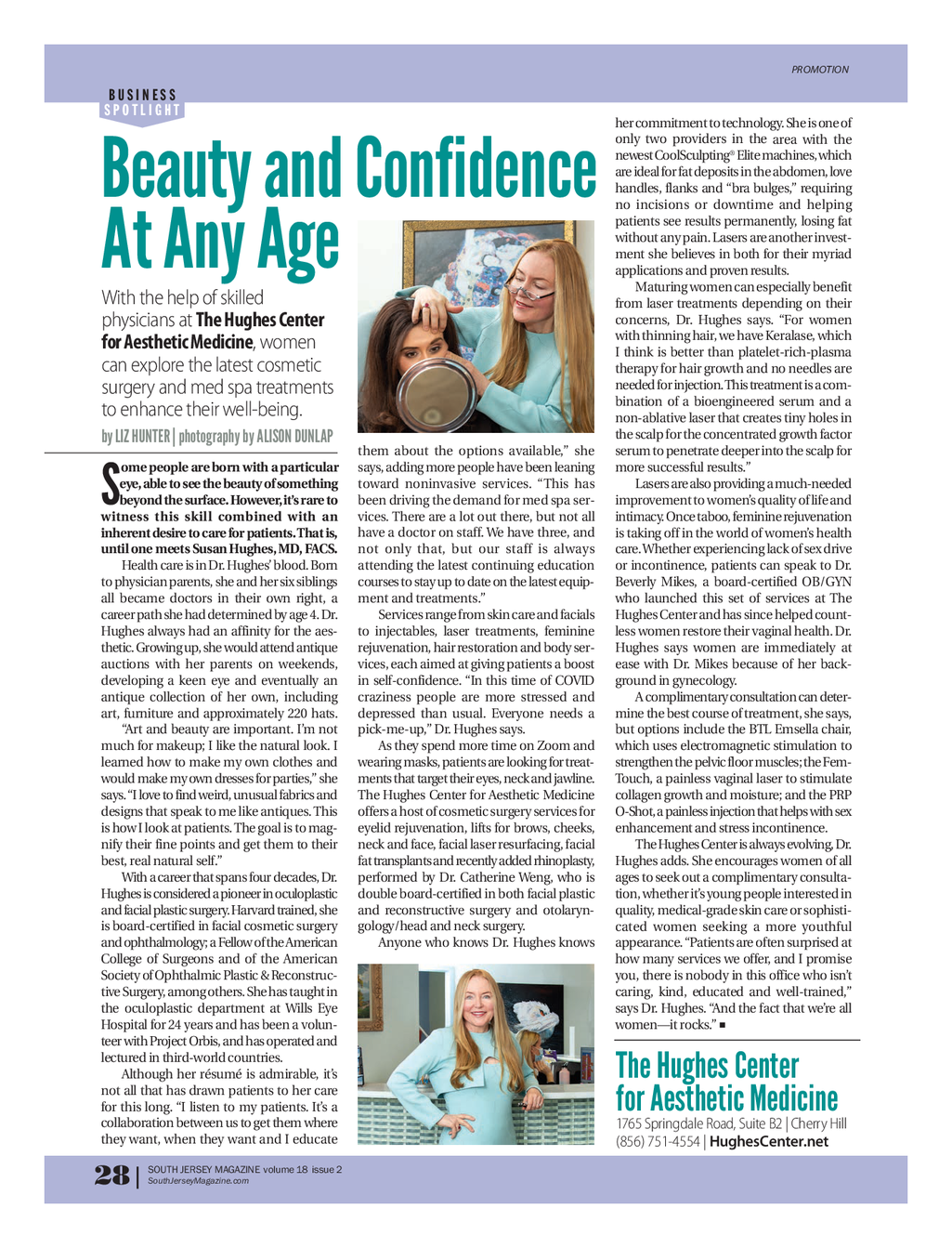 SJM_PROFILE_Hughes_Center_0521_profile 5 / 14 / 21 1 : 13 PM Page 1 PROMOTION BUSINESS S PO TL I G H T her commitment to technology . She is one of only two providers in the area with the ® newest CoolSculpting Elite machines , which are ideal for fat deposits in the abdomen , love handles , flanks and “ bra bulges , ” requiring Beauty and Confidence no incisions or downtime and helping patients see results permanently , losing fat without any pain . Lasers are another invest - ment she believes in both for their myriad At Any Age applications and proven results . Maturing women can especially benefit With the help of skilled from laser treatments depending on their concerns , Dr . Hughes says . “ For women physicians at The Hughes Center with thinning hair , we have Keralase , which for Aesthetic Medicine , women I think is better than platelet - rich - plasma can explore the latest cosmetic therapy for hair growth and no needles are needed for injection . This treatment is a com - surgery and med spa treatments bination of a bioengineered serum and a to enhance their well - being . non - ablative laser that creates tiny holes in the scalp for the concentrated growth factor by LIZ HUNTER | photography by ALISON DUNLAP serum to penetrate deeper into the scalp for them about the options available , ” she more says , adding more people have been leaning successful results . ” ome people are born with a particular toward noninvasive services . “ This has asers are also providing a much - needed eye , able to see the beauty of something L been driving the demand for med spa ser - improvement to women’s quality of life and beyond the surface . However , it’s rare to S vices . There are a lot out there , but not all intimacy . Once taboo , feminine rejuvenation witness this skill combined with an have a doctor on staff . We have three , and is taking off in the world of women’s health inherent desire to care for patients . That is , not only that , but our staff is always care . Whether experiencing lack of sex drive until one meets Susan Hughes , MD , FACS . attending the latest continuing education or incontinence , patients can speak to Dr . Health care is in Dr . Hughes ’ blood . Born courses to stay up to date on the latest equip - Beverly Mikes , a board - certified OB / GYN to physician parents , she and her six siblings ment and treatments . ” who launched this set of services at The all became doctors in their own right , a Services range from skin care and facials Hughes Center and has since helped count - career path she had determined by age 4 . Dr . to injectables , laser treatments , feminine less women restore their vaginal health . Dr . Hughes always had an affinity for the aes - rejuvenation , hair Hughes says women are immediately at thetic . Growing up , she would attend antique restoration and body ser - ease with Dr . Mikes because of her back - auctions with her parents on weekends , vices , each aimed at giving patients a boost ground in gynecology . developing a keen eye and eventually an in self - confidence . “ In this time of COVID A complimentary consultation can deter - antique collection of her own , including craziness people are more stressed and mine the best course of treatment , she says , art , furniture and approximately 220 hats . depressed than usual . Everyone needs a but options include the BTL Emsella chair , “ Art and beauty are important . I’m not pick - me - up , ” Dr . Hughes says . which uses electromagnetic stimulation to much for makeup ; I like the natural look . I As they spend more time on Zoom and strengthen the pelvic floor muscles ; the Fem - wearing masks , patients are looking for treat - learned how to make my own clothes and Touch , a painless vaginal laser to stimulate ments that target their eyes , neck and jawline . would make my own dresses for parties , ” she collagen growth and moisture ; and the PRP The Hughes Center for Aesthetic Medicine says . “ I love to find weird , unusual fabrics and offers a host of cosmetic surgery services for designs that speak to me like antiques . This O - Shot , a painless injection that helps with sex eyelid rejuvenation , lifts for brows , cheeks , is how I look at patients . The goal is to mag - enhancement and stress incontinence . neck and face , facial laser resurfacing , facial nify their fine points and get them to their The Hughes Center is always evolving , Dr . fat transplants and recently added rhinoplasty , best , real natural self . ” Hughes adds . She encourages women of all performed by Dr . Catherine Weng , who is With a career that spans four decades , Dr . ages to seek out a complimentary consulta - double board - certified in both facial plastic Hughes is considered a pioneer in oculoplastic tion , whether it’s young people interested in and reconstructive surgery and otolaryn - and facial plastic surgery . Harvard trained , she quality , medical - grade skin care or sophisti - gology / head and neck surgery . is board - certified in facial cosmetic surgery cated women seeking a more youthful Anyone who knows Dr . Hughes knows and ophthalmology ; a Fellow of the American appearance . “ Patients are often surprised at College of Surgeons and of the American how many services we offer , and I promise Society of Ophthalmic Plastic & Reconstruc - you , there is nobody in this office who isn’t tive Surgery , among others . She has taught in caring , kind , educated and well - trained , ” the oculoplastic department at Wills Eye says Dr . Hughes . “ And the fact that we’re all ? Hospital for 24 years and has been a volun - women — it rocks . ” teer with Project Orbis , and has operated and lectured in third - world countries . The Hughes Center Although her résumé is admirable , it’s not all that has drawn patients to her care for Aesthetic Medicine for this long . “ I listen to my patients . It’s a collaboration between us 