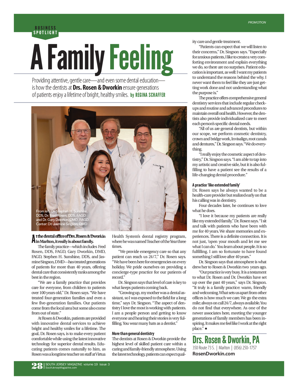 SJM_Rosen DworkinProfile_0622FINAL.qxp_profile 6 / 23 / 22 3 : 56 PM Page 1 PROMOTION B U S I N E S S S P O T L I G H T ity care and gentle treatment . “ Patients can expect that we will listen to their concerns , ” Dr . Singson says . “ Especially for anxious patients , I like to create a very com - forting environment and explain everything we do , so there are no surprises . Patient edu - A Family Feeling cation is important , as well : I want my patients to understand the reasons behind the why . I Providingattentive , gentle care — and even some dental education — never want them to feel like they are just get - ting work done and not understanding what is how the dentists at Drs . Rosen & Dworkin ensure generations the purpose is . ” ofpatients enjoy a lifetime of bright , healthy smiles . by REGINA SCHAFFER Thepractice offers comprehensive general dentistry services that include regular check - ups and routine and advanced procedures to maintain overall oral health . However , the den - tists also provide individualized care to meet each person’s specific dental needs . “ All of us are general dentists , but within our scope , we perform cosmetic dentistry , crown and bridge work , Invisalign , root canals and dentures , ” Dr . Singson says . “ We do every - thing . “ I really enjoy the cosmetic aspect of den - tistry , ” Dr . Singson says . “ I am able to tap into my artistic and creative side , but it is also ful - filling to have a patient see the results of a life - changing dental procedure . ” A practice ‘ like extended family ’ Dr . Rosen says he always wanted to be a health - care provider but realized early on that his calling was in dentistry . Four decades later , he continues to love what he does . From left : Dr . Stephen H . Sunshine , DDS , Dr . Fred Rosen , DDS , FAGD “ I love it because my patients are really and Dr . Gary Dworkin , DMD , FAGD . like my extended family , ” Dr . Rosen says . “ I sit Center:Dr . Jasmine Singson , DMD and talk with patients who have been with me for 40 years . We share memories and ex - t the dental office of Drs . Rosen & Dworkin Health System’s dental registry program , periences . There is a definite connection . It is A in Marlton , it really is about family . where he was named Teacher of the Year three not just , ‘ open your mouth and let me see The family practice — which includes Fred times . what Ican do . ’ You learn about people . It is so Rosen , DDS , FAGD , Gary Dworkin , DMD , “ We provide emergency care so that any fulfilling . I am so fortunate to have found FAGD , Stephen H . Sunshine , DDS , and Jas - patient can reach us 24 / 7 , ” Dr . Rosen says . something I still love after 40 years . ” mine Singson , DMD — has treated generations “ We have been here for emergencies on every Dr . Singson says that atmosphere is what of patients for more than 40 years , offering holiday . We pride ourselves on providing a drew her to Rosen & Dworkin two years ago . dental care that consistently ranks among the concierge - type practice for our patients of “ Ourpractice is very busy . It is a testament best in the region . record . ” to what Dr . Rosen and Dr . Dworkin have set “ We are a family practice that provides Dr . Singson says that level of care is key to up over the past 40 years , ” says Dr . Singson . care for everyone , from children to patients what keeps patients coming back . “ It truly is a family practice : warm , friendly over 100 years old , ” Dr . Rosen says . “ We have “ Growing up , my mother was a dental as - andwelcoming . What sets us apart from other treated four - generation families and even a sistant , so I was exposed to the field for a long officesis how much we care . We go the extra few five - generation families . Our patients time , ” says Dr . Singson . “ The aspect of den - mile ; always on call 24 / 7 , always available . You come from the local area but some also come tistry I love the most is working with patients . do not find that everywhere . As one of the from out of state . ” I am a people person and getting to know newer associates here , meeting the younger At Rosen & Dworkin , patients are provided everyone and hearing their stories is very ful - generations of family members has been in - with innovative dental services to achieve filling . You wear many hats as a dentist . ” spiring . It makes me feel like I work at the right n bright and healthy smiles for a lifetime . The place . ” goal , Dr . Rosen says , is to make every patient More than general dentistry comfortable while using the latest innovative The dentists at Rosen & Dworkin provide the Drs . Rosen & Dworkin , PA technology for superior dental results . Edu - highest level of skilled patient care within a 350Route 73 S . | Marlton | ( 856 ) 250 - 1757 cating patients comes naturally to him , as caring and family - friendly atmosphere . Using RosenDworkin.com Rosen was a longtime teacher on staff at Virtua the latest technology , patients can expect qual - SOUTH JERSEY MAGAZINE volume 19 issue 3 SouthJerseyMagazine.com 28 |
