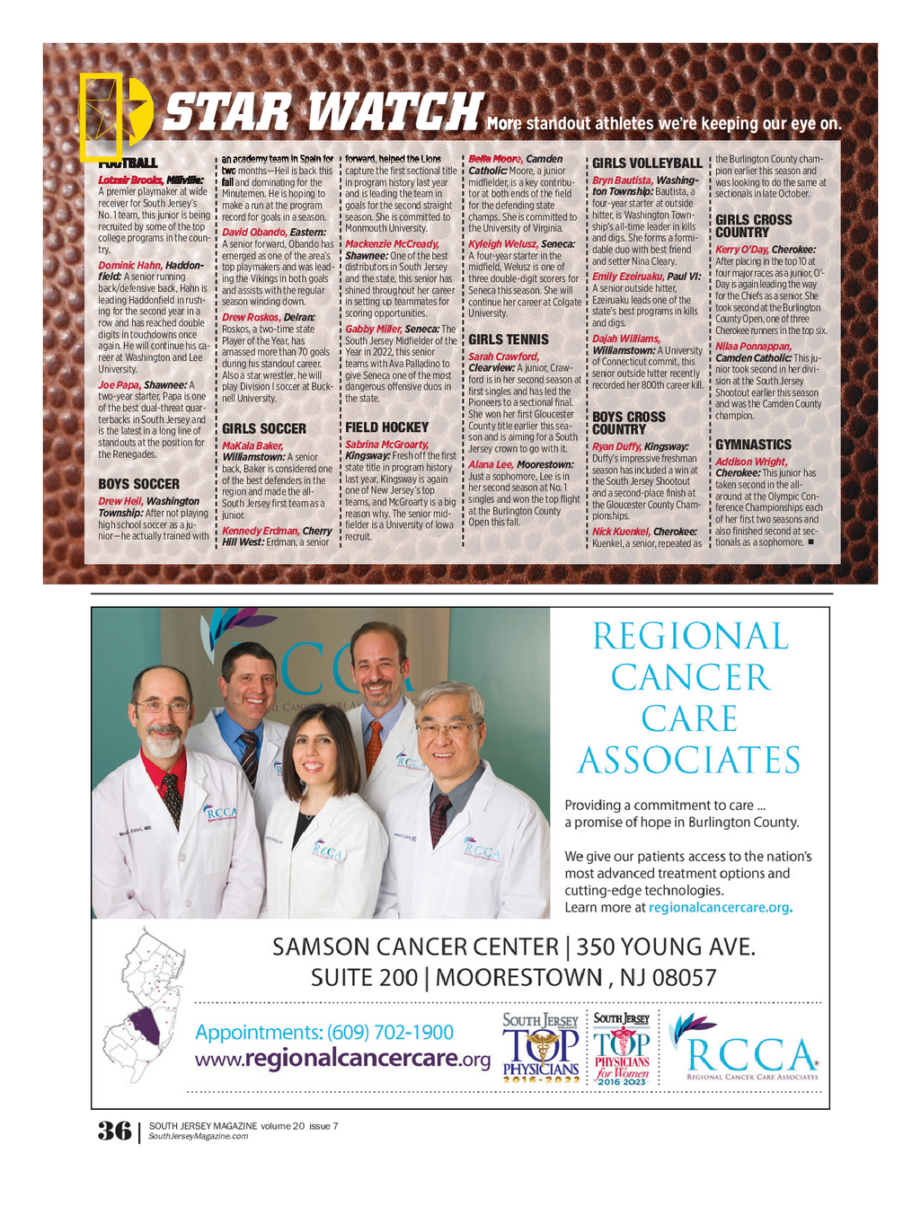 SJM_FallAthletes_1023FINAL_REG4 . qxp_Feature 10 / 19 / 23 11 : 03 AM Page 9 More standout athletes we’re keeping our eye on . STAR WATCH ? an academy team in Spain for forward , helped the Lions Bella Moore , Camden the Burlington County cham - FOOTBALL GIRLS VOLLEYBALL two months — Heil is back this capture the first sectional title Catholic : Moore , a junior pion earlier this season and Lotzeir Brooks , Millville : Bryn Bautista , Washing - fall and dominating for the in program history last year midfielder , is a key contribu - was looking to do the same at A premier playmaker at wide ton Township : Bautista , a Minutemen . He is hoping to and is leading the team in tor at both ends of the field sectionals in late October . receiver for South Jersey’s four - year starter at outside make a run at the program goals for the second straight for the defending state No . 1 team , this junior is being hitter , is Washington Town - record for goals in a season . season . She is committed to champs . She is committed to GIRLS CROSS recruited by some of the top ship’s all - time leader in kills Monmouth University . the University of Virginia . David Obando , Eastern : COUNTRY college programs in the coun - and digs . She forms a formi - A senior forward , Obando has Mackenzie McCready , Kyleigh Welusz , Seneca : try . dable duo with best friend Kerry O’Day , Cherokee : emerged as one of the area’s Shawnee : One of the best A four - year starter in the and setter Nina Cleary . After placing in the top 10 at Dominic Hahn , Haddon - top playmakers and was lead - distributors in South Jersey midfield , Welusz is one of four major races as a junior , O ’ - field : A senior running Emily Ezeiruaku , Paul VI : ing the Vikings in both goals and the state , this senior has three double - digit scorers for Day is again leading the way back / defensive back , Hahn is A senior outside hitter , and assists with the regular shined throughout her career Seneca this season . She will for the Chiefs as a senior . She leading Haddonfield in rush - Ezeiruaku leads one of the season winding down . in setting up teammates for continue her career at Colgate took second at the Burlington ing for the second year in a state’s best programs in kills scoring opportunities . University . Drew Roskos , Delran : County Open , one of three row and has reached double and digs . Roskos , a two - time state Gabby Miller , Seneca : The Cherokee runners in the top six . digits in touchdowns once Dajah Williams , Player of the Year , has GIRLS TENNIS South Jersey Midfielder of the again . He will continue his ca - Nilaa Ponnappan , Williamstown : A University amassed more than 70 goals Year in 2022 , this senior Sarah Crawford , reer at Washington and Lee Camden Catholic : This ju - of Connecticut commit , this during his standout career . teams with Ava Palladino to Clearview : A junior , Craw - University . nior took second in her divi - senior outside hitter recently Also a star wrestler , he will give Seneca one of the most ford is in her second season at sion at the South Jersey Joe Papa , Shawnee : A recorded her 800th career kill . play Division I soccer at Buck - dangerous offensive duos in first singles and has led the Shootout earlier this season two - year starter , Papa is one nell University . the state . Pioneers to a sectional final . and was the Camden County of the best dual - threat quar - She won her first Gloucester champion . BOYS CROSS terbacks in South Jersey and County title earlier this sea - FIELD HOCKEY GIRLS SOCCER COUNTRY is the latest in a long line of son and is aiming for a South standouts at the position for Sabrina McGroarty , MaKala Baker , GYMNASTICS Ryan Duffy , Kingsway : Jersey crown to go with it . the Renegades . Kingsway : Fresh off the first Williamstown : A senior Duffy’s impressive freshman Addison Wright , Alana Lee , Moorestown : state title in program history back , Baker is considered one season has included a win at Cherokee : This junior has Just a sophomore , Lee is in last year , Kingsway is again of the best defenders in the the South Jersey Shootout taken second in the all - BOYS SOCCER her second season at No . 1 one of New Jersey’s top region and made the all - and a second - place finish at around at the Olympic Con - singles and won the top flight Drew Heil , Washington teams , and McGroarty is a big South Jersey first team as a the Gloucester County Cham - ference Championships each at the Burlington County Township : After not playing reason why . The senior mid - junior . pionships . of her first two seasons and Open this fall . high school soccer as a ju - fielder is a University of Iowa Kennedy Erdman , Cherry also finished second at sec - Nick Kuenkel , Cherokee : nior — he actually trained with recruit . n Hill West : Erdman , a senior tionals as a sophomore . Kuenkel , a senior , repeated as SOUTH JERSEY MAGAZINE volume 20 issue 7 SouthJerseyMagazine.com 36 |