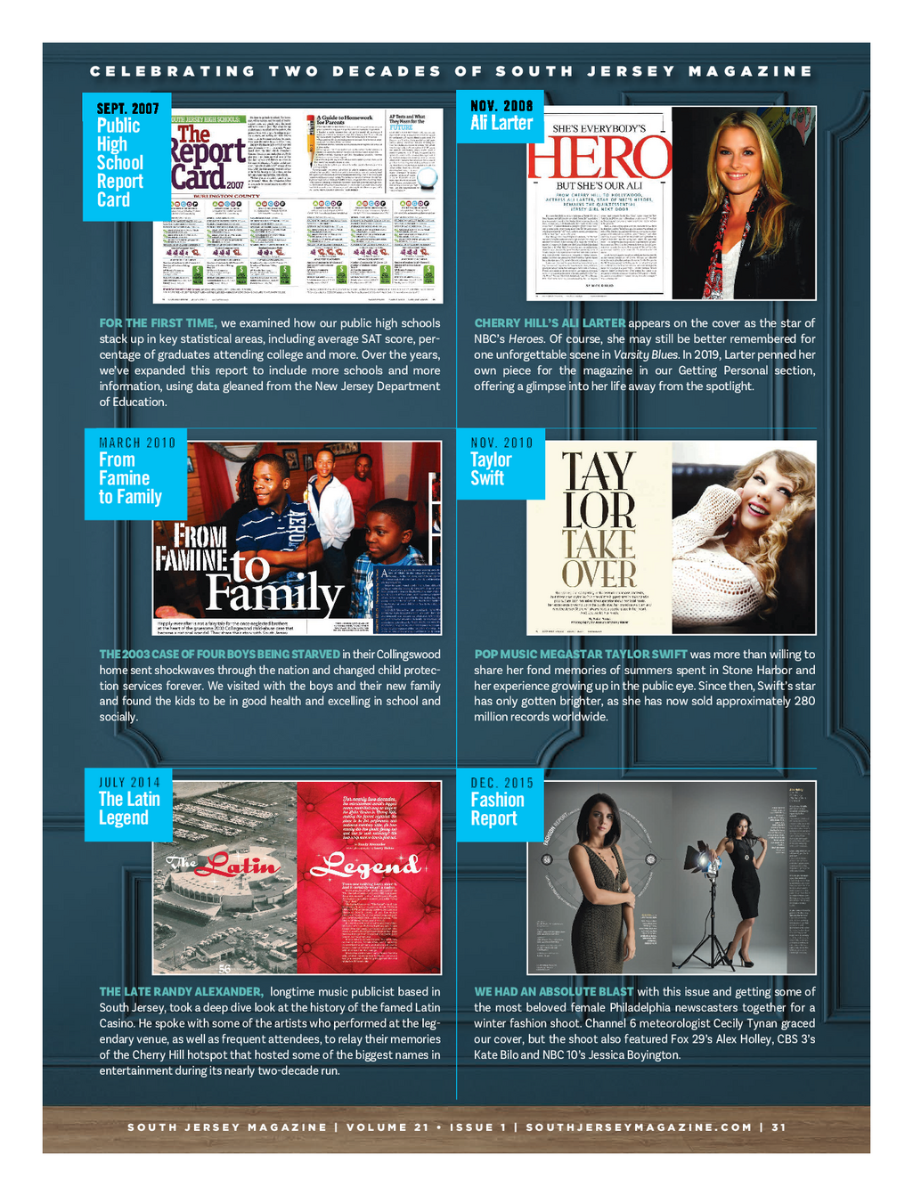 0424 20th Anniversary - FINAL_SJM Feature 4 / 26 / 24 3 : 08 PM Page 4 C E L E B R A T I N G T W O D E C A D E S O F S O U T H J E R S E Y M A G A Z I N E NOV . 2008 SEPT . 2007 Ali Larter Public High School Report Card FOR THE FIRST TIME , we examined how our public high schools CHERRY HILL’S ALI LARTER appears on the cover as the star of stack up in key statistical areas , including average SAT score , per - NBC’s Heroes . Of course , she may still be better remembered for centage of graduates attending college and more . Over the years , one unforgettable scene in Varsity Blues . In 2019 , Larter penned her we’ve expanded this report to include more schools and more own piece for the magazine in our Getting Personal section , information , using data gleaned from the New Jersey Department offering a glimpse into her life away from the spotlight . of Education . NOV . 2010 MARCH 2010 Taylor From Swift Famine toFamily THE 2003 CASE OF FOUR BOYS BEING STARVED in their Collingswood POP MUSIC MEGASTAR TAYLOR SWIFT was more than willing to home sent shockwaves through the nation and changed child protec - share her fond memories of summers spent in Stone Harbor and tion services forever . We visited with the boys and their new family her experience growing up in the public eye . Since then , Swift’s star and found the kids to be in good health and excelling in school and has only gotten brighter , as she has now sold approximately 280 socially . million records worldwide . JULY 2014 DEC . 2015 The Latin Fashion Legend Report THE LATE RANDY ALEXANDER , longtime music publicist based in WE HAD AN ABSOLUTE BLAST with this issue and getting some of South Jersey , took a deep dive look at the history of the famed Latin the most beloved female Philadelphia newscasters together for a Casino . He spoke with some of the artists who performed at the leg - winter fashion shoot . Channel 6 meteorologist Cecily Tynan graced endary venue , as well as frequent attendees , to relay their memories our cover , but the shoot also featured Fox 29 ’ s Alex Holley , CBS 3 ’ s of the Cherry Hill hotspot that hosted some of the biggest names in Kate Bilo and NBC 10 ’ s Jessica Boyington . entertainment during its nearly two - decade run . S O U T H J E R S E Y M A G A Z I N E | V O L U M E 2 1 • I S S U E 1 | S O U T H J E R S E Y M A G A Z I N E . C O M | 3 1