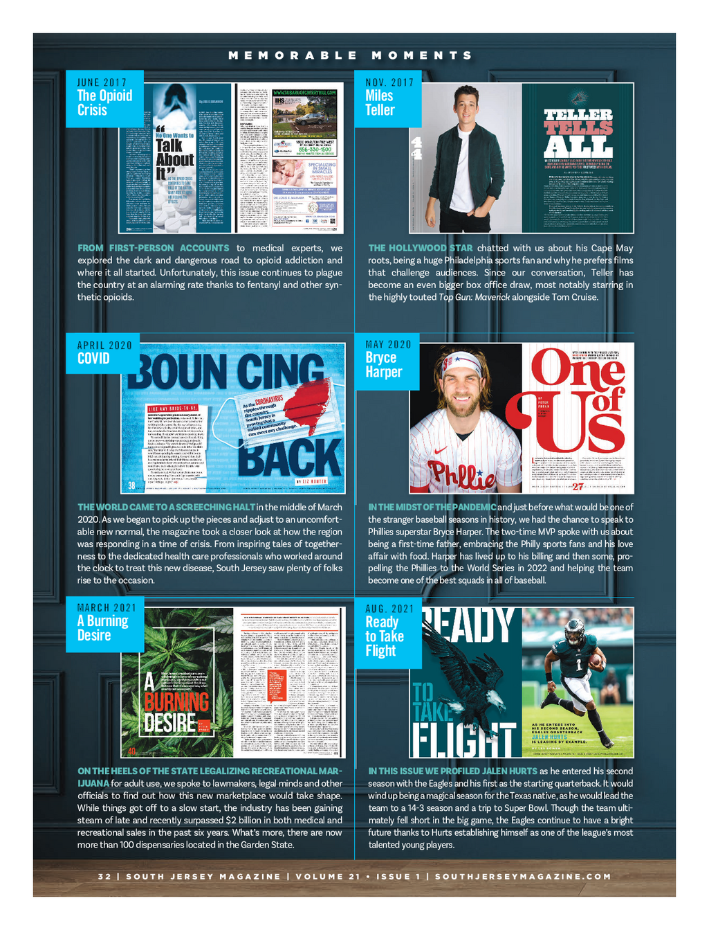 0424 20th Anniversary - FINAL_SJM Feature 4 / 26 / 24 3 : 08 PM Page 5 M E M O R A B L E M O M E N T S JUNE 2017 NOV . 2017 The Opioid Miles Crisis Teller FROM FIRST - PERSON ACCOUNTS to medical experts , we THE HOLLYWOOD STAR chatted with us about his Cape May explored the dark and dangerous road to opioid addiction and roots , being a huge Philadelphia sports fan and why he prefers films where it all started . Unfortunately , this issue continues to plague that challenge audiences . Since our conversation , Teller has the country at an alarming rate thanks to fentanyl and other syn - become an even bigger box office draw , most notably starring in thetic opioids . the highly touted Top Gun : Maverick alongside Tom Cruise . MAY 2020 APRIL 2020 Bryce COVID Harper THE WORLD CAME TO A SCREECHING HALT in the middle of March IN THE MIDST OF THE PANDEMIC and just before what would be one of 2020 . As we began to pick up the pieces and adjust to an uncomfort - the stranger baseball seasons in history , we had the chance to speak to able new normal , the magazine took a closer look at how the region Phillies superstar Bryce Harper . The two - time MVP spoke with us about was responding in a time of crisis . From inspiring tales of together - being a first - time father , embracing the Philly sports fans and his love ness to the dedicated health care professionals who worked around affair with food . Harper has lived up to his billing and then some , pro - the clock to treat this new disease , South Jersey saw plenty of folks pelling the Phillies to the World Series in 2022 and helping the team rise to the occasion . become one of the best squads in all of baseball . MARCH 2021 AUG . 2021 A Burning Ready Desire toTake Flight ON THE HEELS OF THE STATE LEGALIZING RECREATIONAL MAR - IN THIS ISSUE WE PROFILED JALEN HURTS as he entered his second IJUANA for adult use , we spoke to lawmakers , legal minds and other season with the Eagles and his first as the starting quarterback . It would officials to find out how this new marketplace would take shape . wind up being a magical season for the Texas native , as he would lead the While things got off to a slow start , the industry has been gaining team to a 14 - 3 season and a trip to Super Bowl . Though the team ulti - steam of late and recently surpassed $ 2 billion in both medical and mately fell short in the big game , the Eagles continue to have a bright recreational sales in the past six years . What’s more , there are now future thanks to Hurts establishing himself as one of the league’s most more than 100 dispensaries located in the Garden State . talented young players . 3 2 | S O U T H J E R S E Y M A G A Z I N E | V O L U M E 2 1 • I S S U E 1 | S O U T H J E R S E Y M A G A Z I N E . C O M