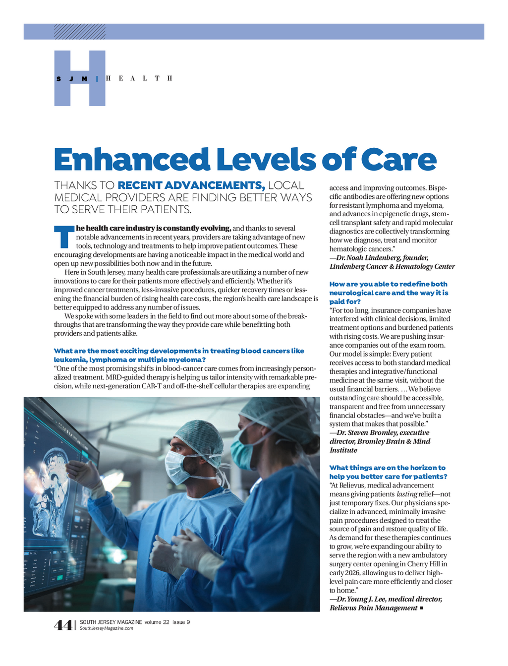 SJM 1225 Health_Dept 12 / 18 / 25 3 : 45 PM Page 1 H E A L T H H Enhanced Levels of Care THANKS TO RECENT ADVANCEMENTS , LOCAL accessand improving outcomes . Bispe - cific antibodies are offering new options MEDICAL PROVIDERS ARE FINDING BETTER WAYS forresistant lymphoma and myeloma , TO SERVE THEIR PATIENTS . andadvances in epigenetic drugs , stem - cell transplant safety and rapid molecular he health care industry is constantly evolving , and thanks to several diagnosticsare collectively transforming notableadvancements in recent years , providers are taking advantage of new howwe diagnose , treat and monitor Ttools , technology and treatments to help improve patient outcomes . These hematologiccancers . ” encouragingdevelopments are having a noticeable impact in the medical world and — Dr.Noah Lindenberg , founder , open up new possibilities both now and in the future . Lindenberg Cancer & Hematology Center Herein South Jersey , many health care professionals are utilizing a number of new innovations to care for their patients more effectively and efficiently . Whether it’s Howare you able to redefine both improvedcancer treatments , less - invasive procedures , quicker recovery times or less - neurologicalcare and the way it is eningthe financial burden of rising health care costs , the region’s health care landscape is paidfor ? betterequipped to address any number of issues . “ For too long , insurance companies have Wespoke with some leaders in the field to find out more about some of the break - interferedwith clinical decisions , limited throughsthat are transforming the way they provide care while benefitting both treatmentoptions and burdened patients providersand patients alike . with rising costs . We are pushing insur - ance companies out of the exam room . Whatare the most exciting developments in treating blood cancers like Ourmodel is simple : Every patient leukemia , lymphoma or multiple myeloma ? receivesaccess to both standard medical “ Oneof the most promising shifts in blood - cancer care comes from increasingly person - therapiesand integrative / functional alizedtreatment . MRD - guided therapy is helping us tailor intensity with remarkable pre - medicineat the same visit , without the cision , while next - generation CAR - T and off - the - shelf cellular therapies are expanding usualfinancial barriers . … We believe outstanding care should be accessible , transparent and free from unnecessary financial obstacles — and we’ve built a system that makes that possible . ” — Dr . Steven Bromley , executive direc tor , Bromley Brain & Mind Institute What things are on the horizon to help you better care for patients ? “ At Relievus , medical advancement means giving patients lastingrelief — not just temporary fixes . Our physicians spe - cialize in advanced , minimally invasive pain procedures designed to treat the source of pain and restore quality of life . As demand for these therapies continues to grow , we’re expanding our ability to serve the region with a new ambulatory surgery center opening in Cherry Hill in early 2026 , allowing us to deliver high - level pain care more efficiently and closer to home . ” — Dr . Young J . Lee , medical director , Relievus Pain Management SOUTH JERSEY MAGAZINE volume 22 issue 9 SouthJerseyMagazine.com 44 |